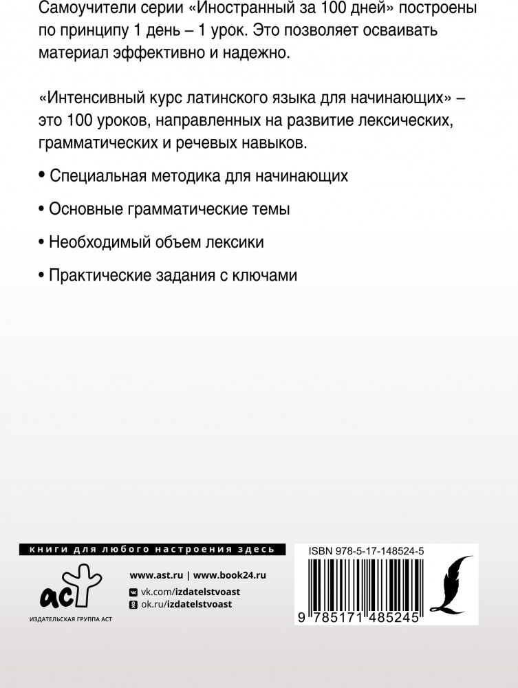 Данное учебное издание содержит лексический и грамматический материал для изучения латинского языка с нулевого уровня. Курс разбит на 100 уроков, на изучение каждого потребуется 1 день. Для закрепления теории, отработки языковых навыков и употребления единиц в речи предлагается большое количество упражнений с ключами.