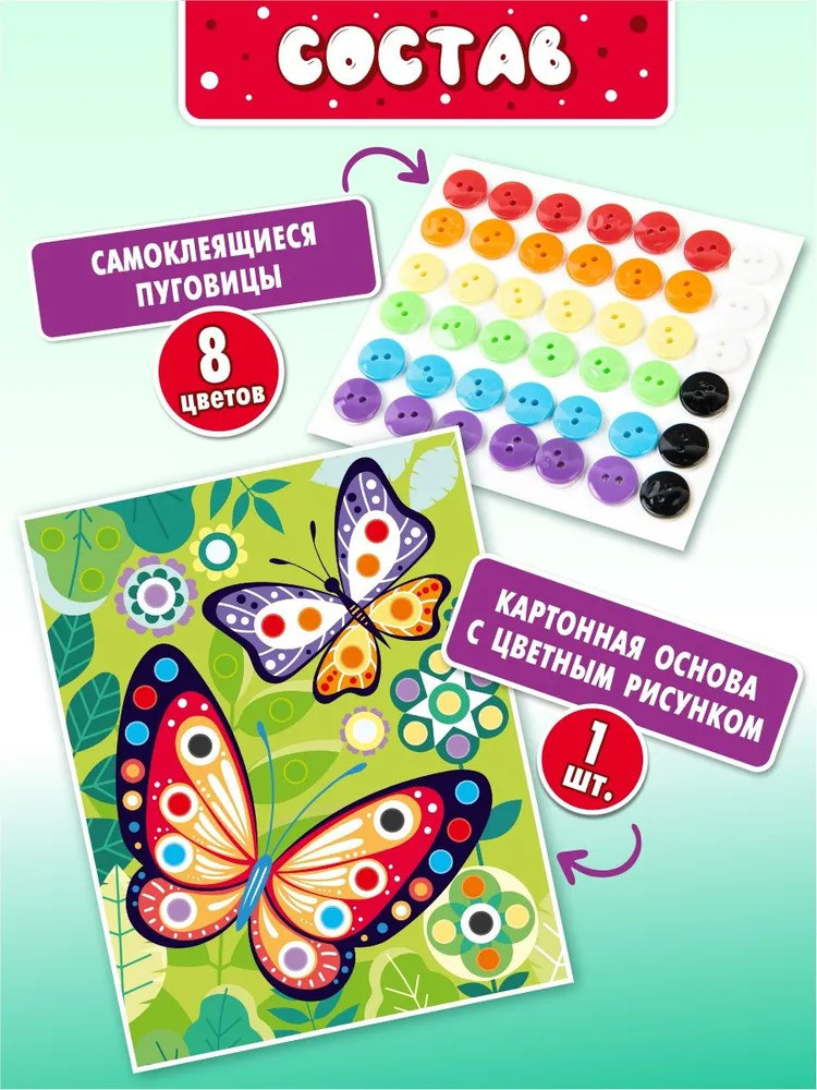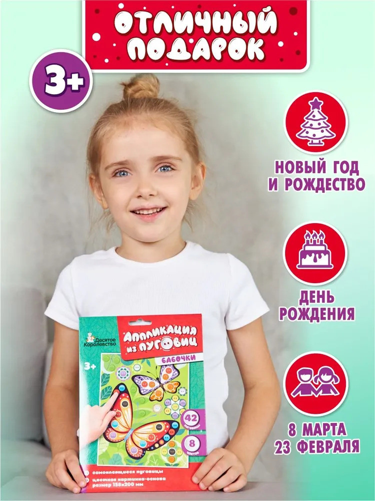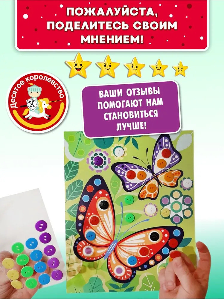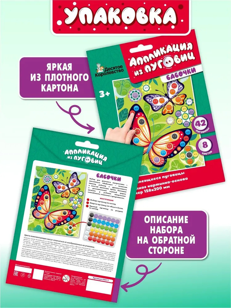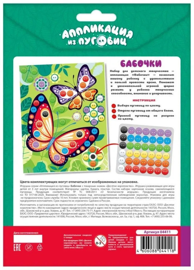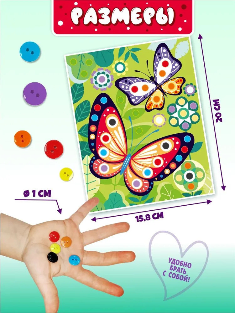 💳 Оплатить за товар можно при получении 🇰🇿 Есть бесплатная доставка по Казахстану от 1 дня 🎁 Копите бонусы с каждой покупки Набор для детского творчества Аппликация из пуговиц «Бабочки» обязательно увлечет Вашего малыша яркими цветами и оригинальным исполнением! Данный набор является не только отличным развивающим пособием для Вашего малыша, но также может служить украшением интерьера или стать необычным подарком для друзей и близких. Набор Аппликация из пуговиц «Бабочки» развивает творческие способности ребёнка, внимание, усидчивость и мелкую моторику. |
