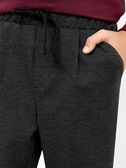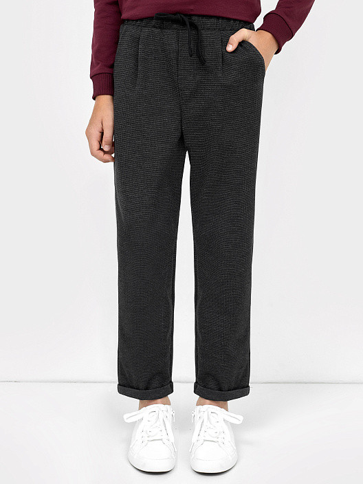 Удобные брюки прямого силуэта с классической посадкой на талии для мальчиков. В поясе — эластичная тесьма и шнурок-завязка, который позволяет регулировать ширину в талии. Есть удобные боковые карманы. Гульфик — имитация. Штанины оканчиваются подворотами. Хороший вариант для школы и мероприятий, предполагающих официальный стиль одежды.