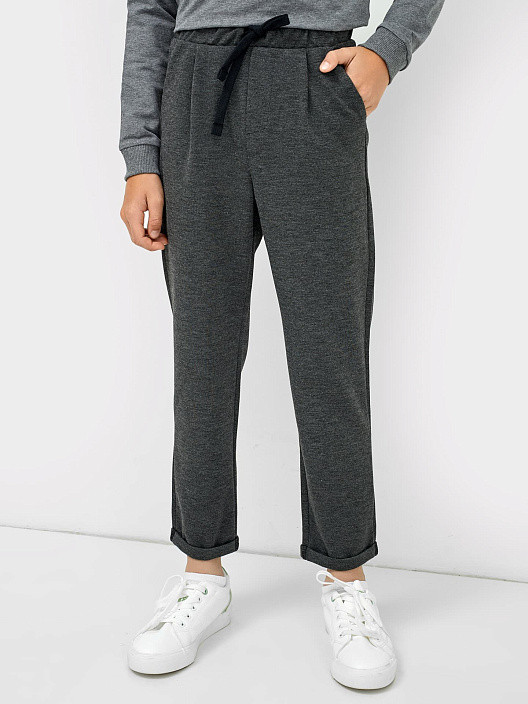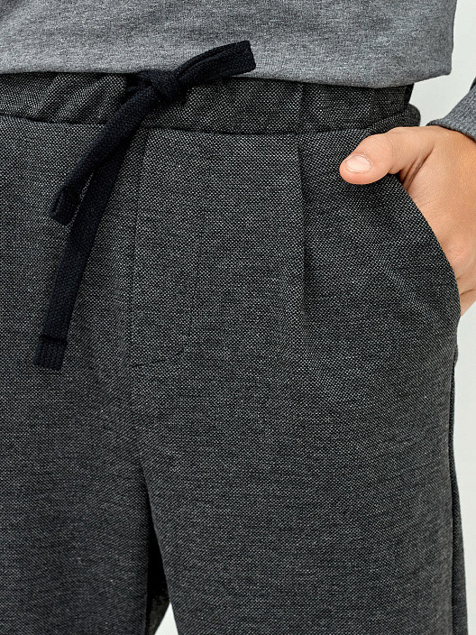 Удобные брюки прямого силуэта с классической посадкой на талии для мальчиков. В поясе — эластичная тесьма и шнурок-завязка, который позволяет регулировать ширину в талии. Есть удобные боковые карманы. Гульфик — имитация. Штанины оканчиваются подворотами. Хороший вариант для школы и мероприятий, предполагающих официальный стиль одежды.