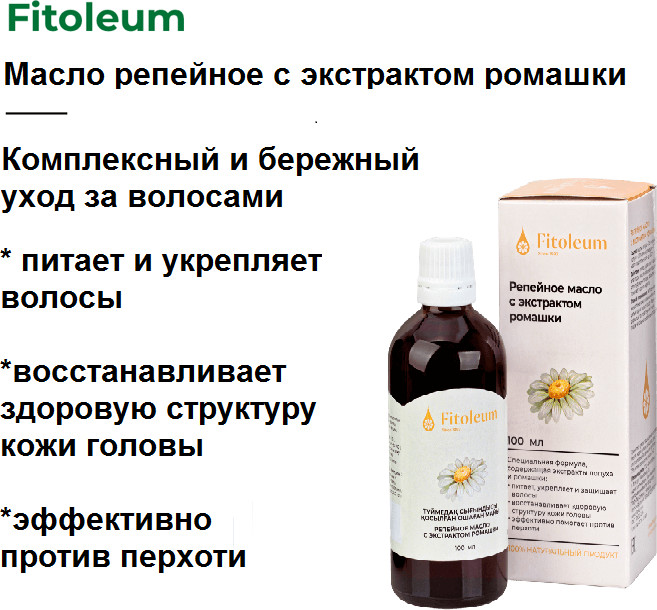 💳 Оплатить за товар можно при получении 🇰🇿 Есть бесплатная доставка по Казахстану от 1 дня 🎁 Копите бонусы с каждой покупки Fitoleum репейное масло с экстрактом ромашки — лечебно-косметическое средство для роста и укрепления сухих волос. Содержит природный инулин, протеин, эфирные и жирные масла (пальмитиновую и стеариновую кислоты, дубильные вещества, минеральные соли и витамины). Это уникальный фитоактиватор, обладающий благотворным лечебным действием, не содержащий консервантов, ароматизаторов, красителей. Специальная формула содержит экстракт лопуха и крапивы, которая: питает и защищает волосы, восстанавливает здоровую структуру кожи головы, предупреждает образование перхоти, улучшает структуру ногтей. |