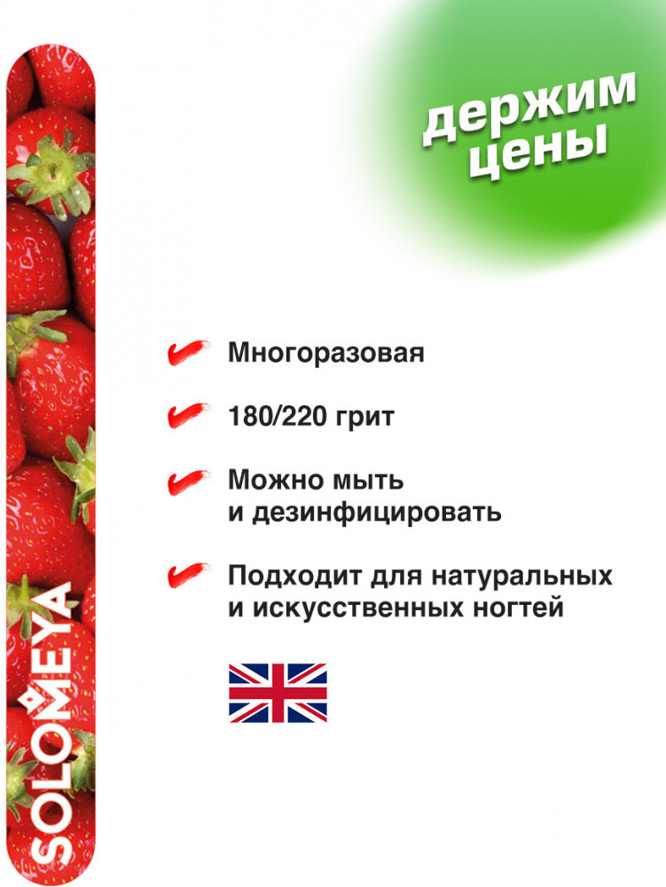 Красивая, яркая и удобная пилка — незаменимый помощник в маникюре! Двусторонняя пилочка 180/220 грит предназначена для придания формы и корректировки длины натуральных и искусственных ногтей. Подходит для домашнего и салонного использования. Пилка изготовлена из прочной абразивной бумаги, ее можно подвергать санитарной обработке и промывать водой. Она верно прослужит вам долгое время благодаря своей износоустойчивости! Яркий и сочный дизайн «Клубничный Смузи» добавит нотки летнего настроения!