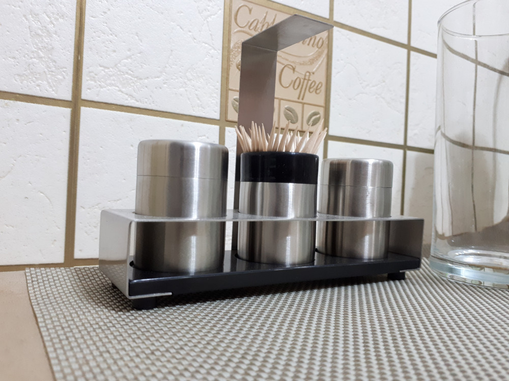 Набор очень красивый, стильный дизайн, качество отличное. Матовое покрытие, что придает особый шик. Емкости для перца и соли не закручиваются, а плотно задвигаются, держатся очень плотно и это очень удобно. Дырочки для сыпучих нормального размера, не забиваются солью и перцем. Приобретала с хорошей скидкой, что очень порадовало. Спасибо любимому магазину. Рекомендую приобретать.