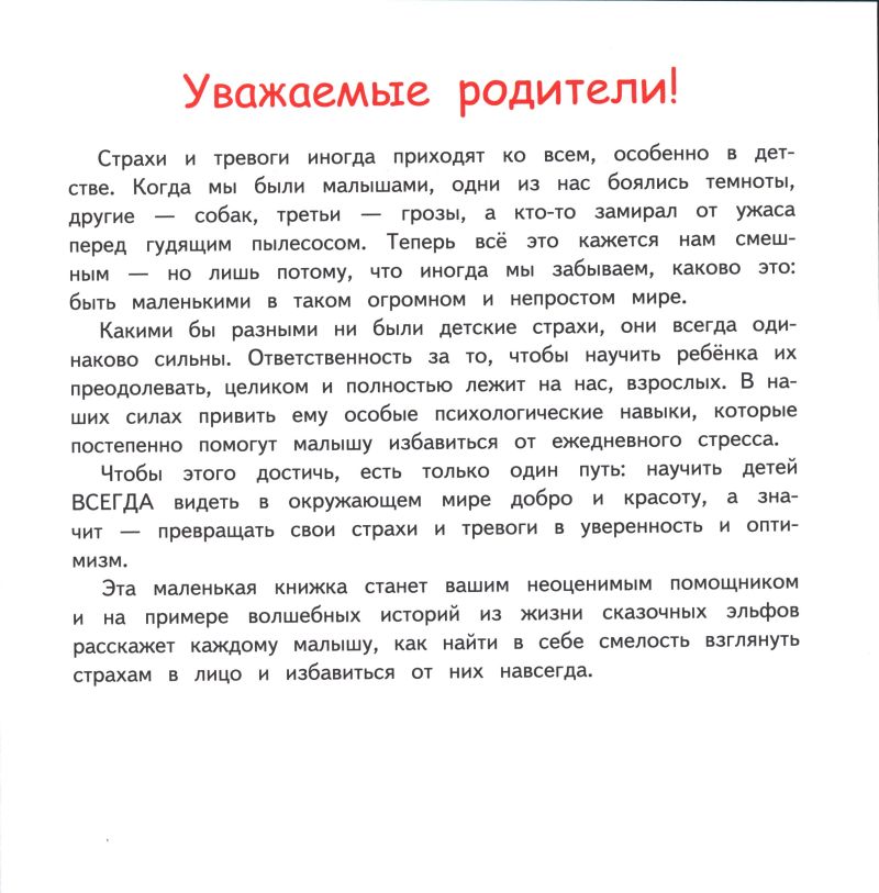 Я бы завела эту книгу во все детские библиотечки, ведь в ней на примерах эльфов обыгрываются ситуации, которые могут вызывать у ребенка страхи и рассказывается, как с ними бороться. Полезные советы в форме диалога, когда старший друг, рассказывает младшему другу, как выйти из той или иной ситуации очень помогаю ребенку посмотреть на свои страхи немного под другим углом и справится с ними. А взрослым поможет правильно понимать, почему ребенок боится и как правильно ему помочь.