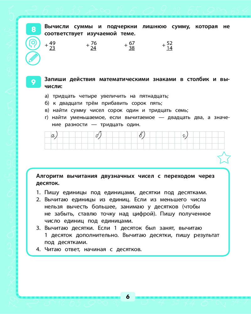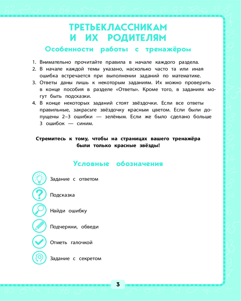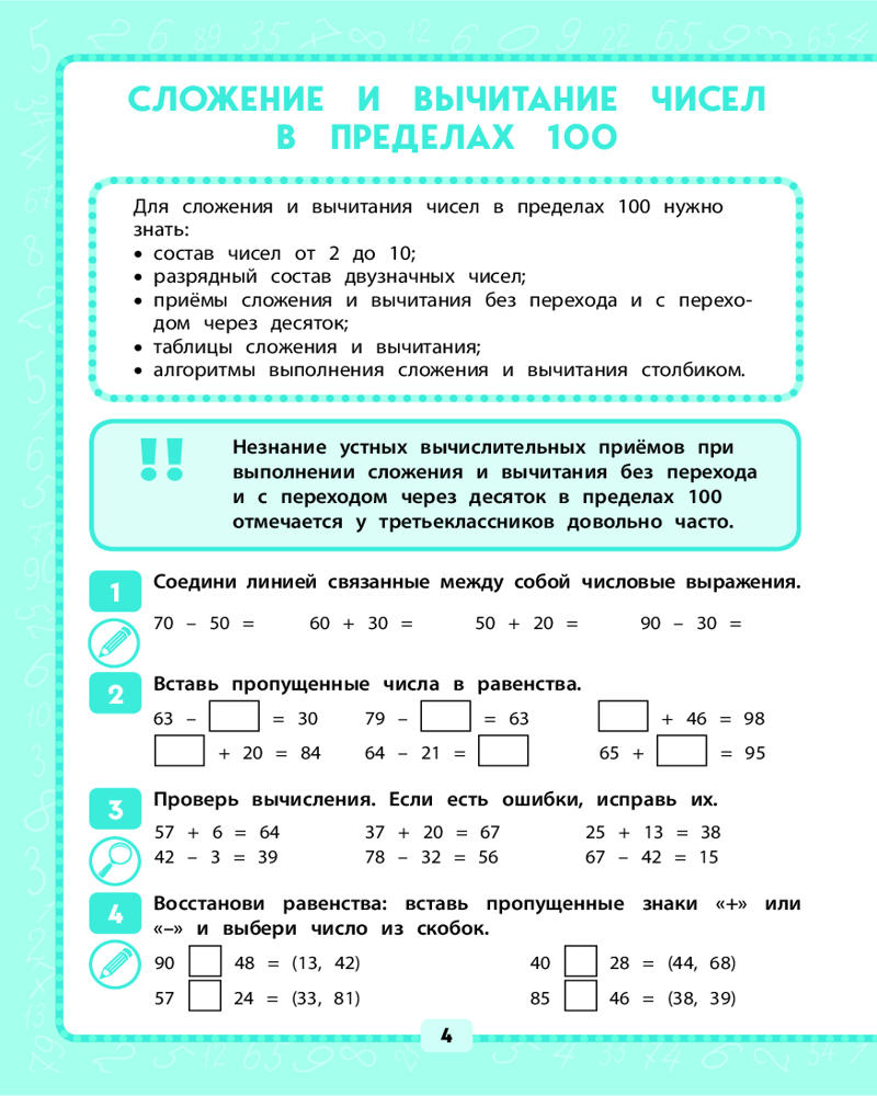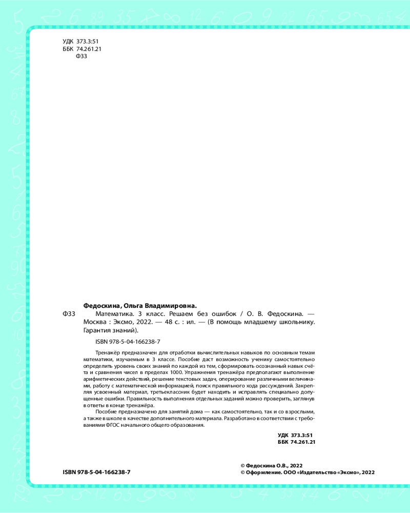 💳 Оплатить за товар можно при получении 🇰🇿 Есть бесплатная доставка по Казахстану от 1 дня 🎁 Копите бонусы с каждой покупки Азы математической грамотности закладываются в начальной школе. На этом этапе очень важно устранить причины ошибок, которые часто допускаются при вычислениях или математических рассуждениях. В тренажёре даны задания для предотвращения или исправления наиболее распространённых ошибок по всем темам, изучаемым в 3 классе. Ученик может определить уровень своих знаний по каждой из тем и отработать те из них, где у него выявились проблемы. Задания разного уровня сложности позволяют закрепить вычислительные навыки и самостоятельно находить ошибки. Отдельные задания снабжены подсказками и ответами. |