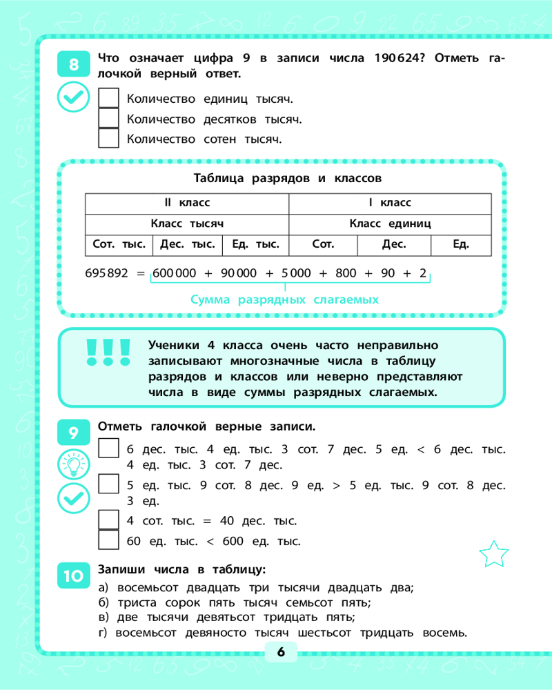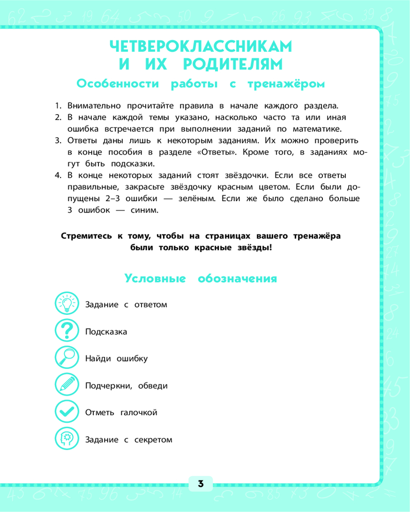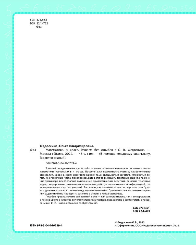💳 Оплатить за товар можно при получении 🇰🇿 Есть бесплатная доставка по Казахстану от 1 дня 🎁 Копите бонусы с каждой покупки Азы математической грамотности закладываются в начальной школе. На этом этапе очень важно устранить причины ошибок, которые часто допускаются при вычислениях или математических рассуждениях. В тренажёре даны задания для предотвращения или исправления наиболее распространённых ошибок по всем темам, изучаемым в 4 классе. Ученик может определить уровень своих знаний по каждой из тем и отработать те из них, где у него выявились проблемы. Задания разного уровня сложности позволяют закрепить вычислительные навыки и самостоятельно находить ошибки. Отдельные задания снабжены подсказками и ответами. |