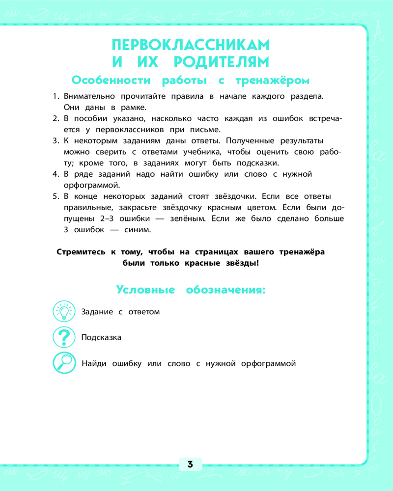 💳 Оплатить за товар можно при получении 🇰🇿 Есть бесплатная доставка по Казахстану от 1 дня 🎁 Копите бонусы с каждой покупки Основы грамотного письма закладываются в начальной школе. Тогда же формируется и красивый, разборчивый почерк. Именно на этом этапе важно устранить причины орфографических, грамматических и пунктуационных ошибок. В тренажёре даны задания для предотвращения или исправления наиболее распространённых ошибок по всем темам, изучаемым в 1 классе. Ученик может определить уровень своих знаний по каждой из тем и отработать те из них, где у него обозначились проблемы. Задания разного уровня сложности позволяют закрепить навыки грамотного письма и самостоятельно находить ошибки. Отдельные задания снабжены подсказками и ответами. |