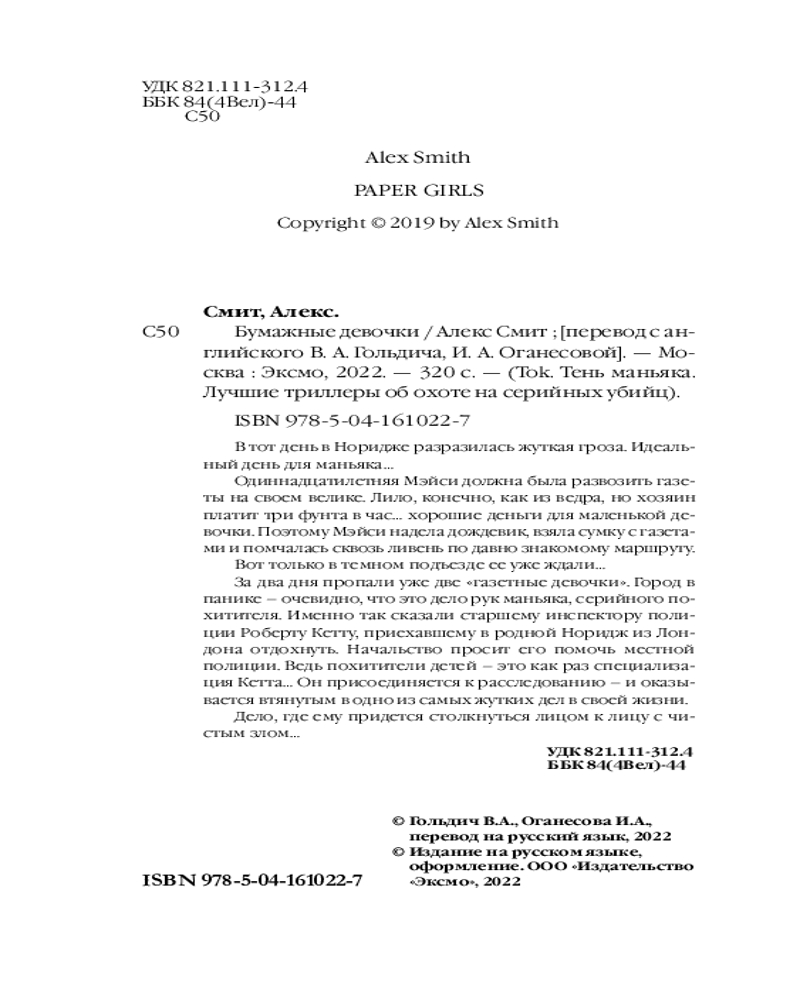 За два дня пропали уже две «газетные девочки». Город в панике — очевидно, что это дело рук маньяка, серийного похитителя. Именно так сказали старшему инспектору полиции Роберту Кетту, приехавшему в родной Норидж из Лондона отдохнуть. Начальство просит его помочь местной полиции. Ведь похитители детей — это как раз специализация Кетта... Он присоединяется к расследованию — и оказывается втянутым в одно из самых жутких дел в своей жизни.