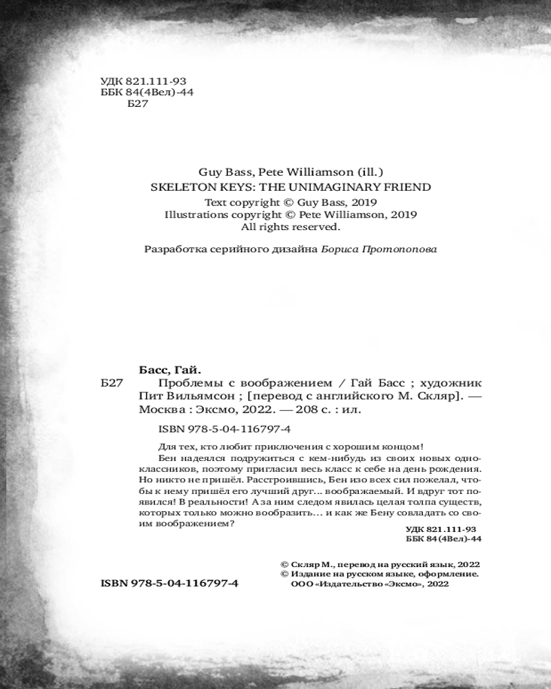💳 Оплатить за товар можно при получении 🇰🇿 Есть бесплатная доставка по Казахстану от 1 дня 🎁 Копите бонусы с каждой покупки Для тех, кто хочет найти настоящих друзей! (И любит приключения с хорошим концом.) У Бена есть друг. Один-единственный, да к тому же воображаемый. Бен рад бы иметь реальных друзей, но его семья слишком часто переезжает с места на место, и ему никак не удаётся с кем-нибудь подружиться. Но однажды лучший друг Бена вдруг оказывается реальным. Реальнее не бывает! И он устраивает совершенно реальный ТА-РА-РАМ. Что же делать? Как унять друга? И что говорить родителям и в школе? И, если Бен всё это придумал, как ему совладать со своим воображением? Гай Басс — известный британский писатель и иллюстратор. Он пишет книги про мальчиков, потому что хорошо помнит, каково это — быть ребёнком, но среди героев у него и девочки, и мальчики, и скелет с ключами вместо пальцев, и даже невообразимый друг... В книге шикарные иллюстрации и крупный шрифт, который удобно читать. |