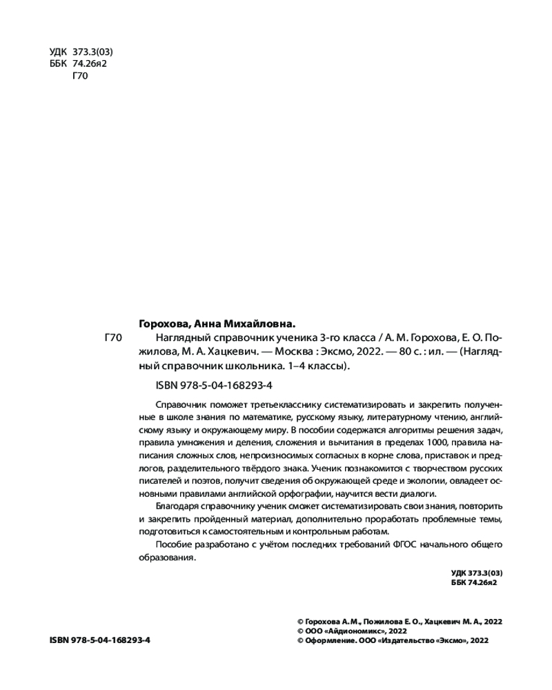 Наглядный справочник ученика. 3 классАнна Михайловна Горохова, Мария Александровна Хацкевич, Елена Олеговна Пожилова В данный момент этот товар отсутствует в продаже. Возможно, у нас найдется аналогичный или похожий товар здесь. Пособие включает в себя основные темы, изучаемые в 3 классе по математике, русскому языку, литературному чтению, английскому языку и окружающему миру. Справочно-информационный материал представлен в наглядной и доступной форме — в виде таблиц, схем, алгоритмов и памяток. Справочник разработан в соответствии с последними требованиями ФГОС начального общего образования. С его помощью ученик сможет систематизировать свои знания, повторить и закрепить пройденный материал, дополнительно проработать проблемные темы, подготовиться к самостоятельным и контрольным работам. |