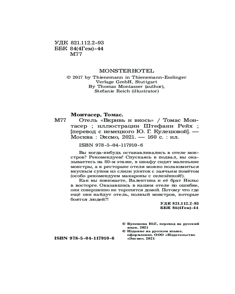 Отель «Вкривь и вкось»В данный момент этот товар отсутствует в продаже. Возможно, у нас найдется аналогичный или похожий товар здесь. Добро пожаловать в отель для монстров! Что вам больше по душе: рум-тур по отелю, которому больше двухсот лет, или, может быть, загляните в наш ресторанчик: рекомендуем суп из слизи улиток с заячьим помётом и макароны с селезёнкой! Валентина и её младший брат настолько впечатлились превосходными условиями нашего отеля, что не хотели возвращаться домой! |