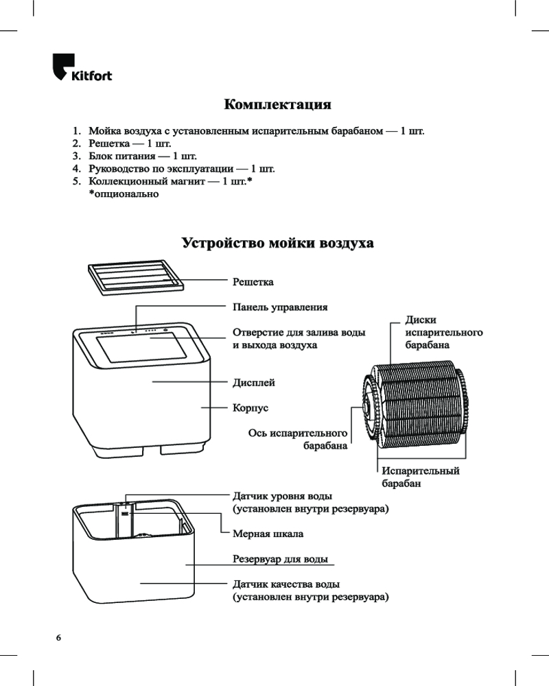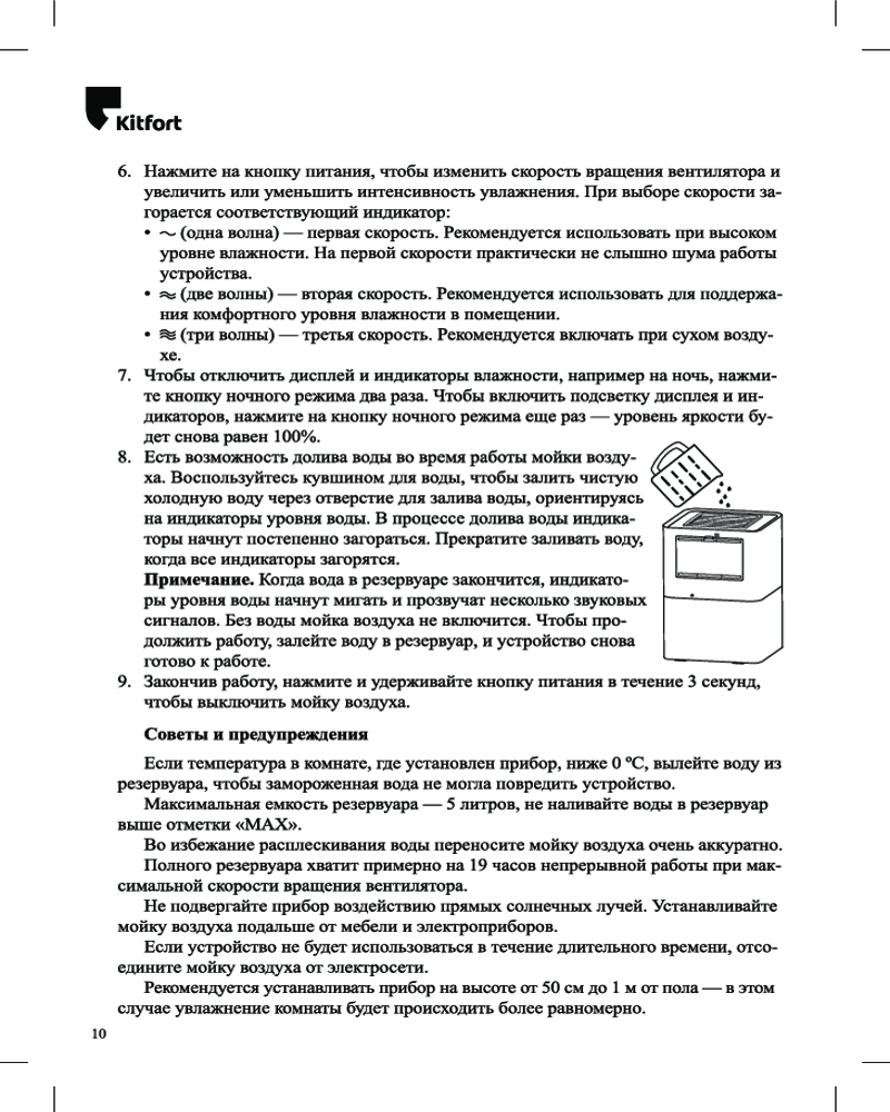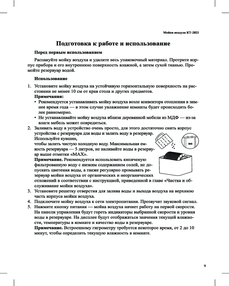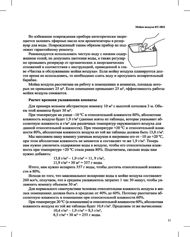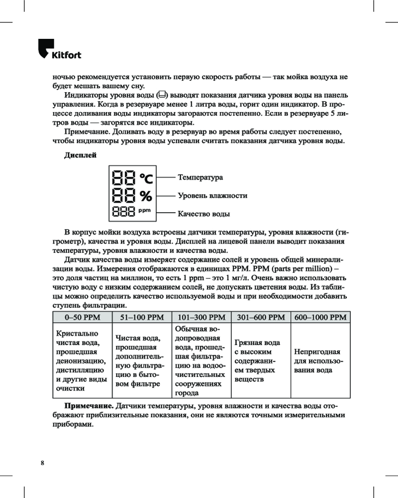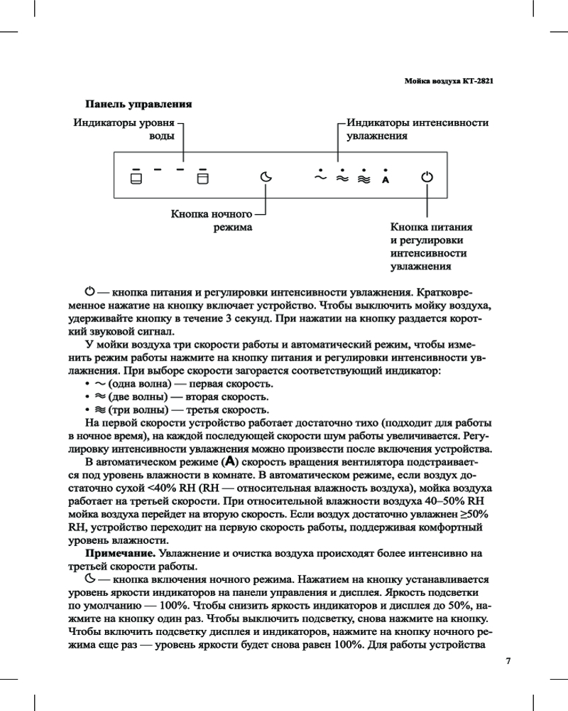 Мойка воздуха КТ-2821 увлажняет воздух в помещении, создавая хороший микроклимат площадью до 25 м². Она оборудована встроенными датчиками уровня влажности (гигрометром), температуры, качества и уровня воды.