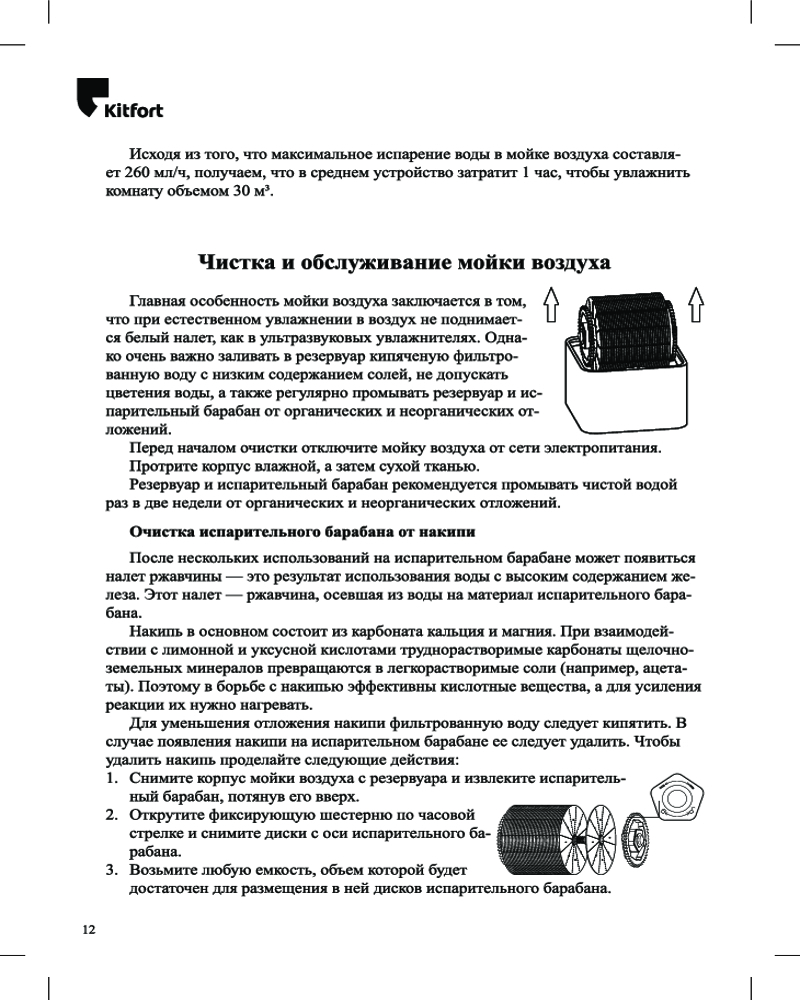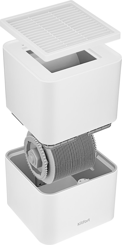 Принцип работы таков: воздух, поступающий в прибор, проходит через испарительный барабан, погруженный в воду. Пыль, микрочастицы и примеси удерживаются на испарительном барабане и затем оседают в резервуаре с водой, а воздух выходит чистым и увлажнённым.
