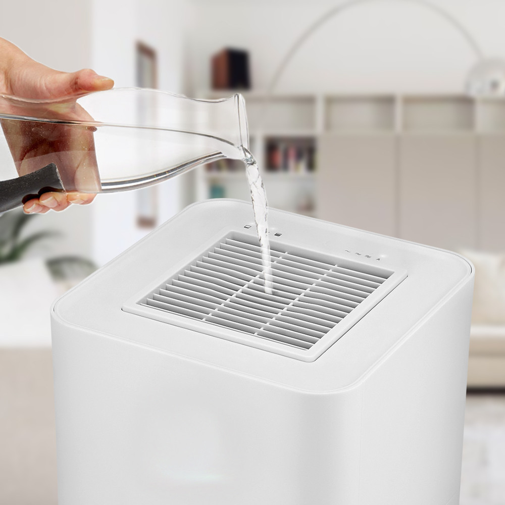 Для залива воды в резервуар его не нужно снимать как во многих других увлажнителях. Используйте кувшин или любую удобную ёмкость, чтобы подливать воду во время работы устройства.