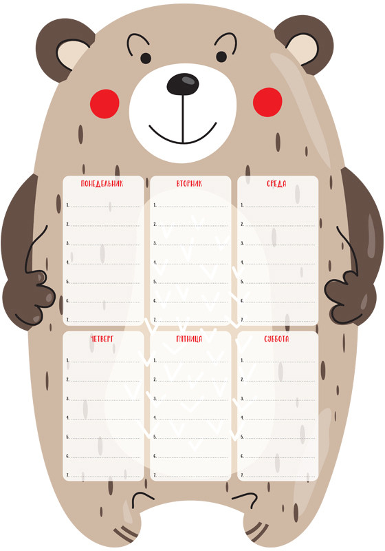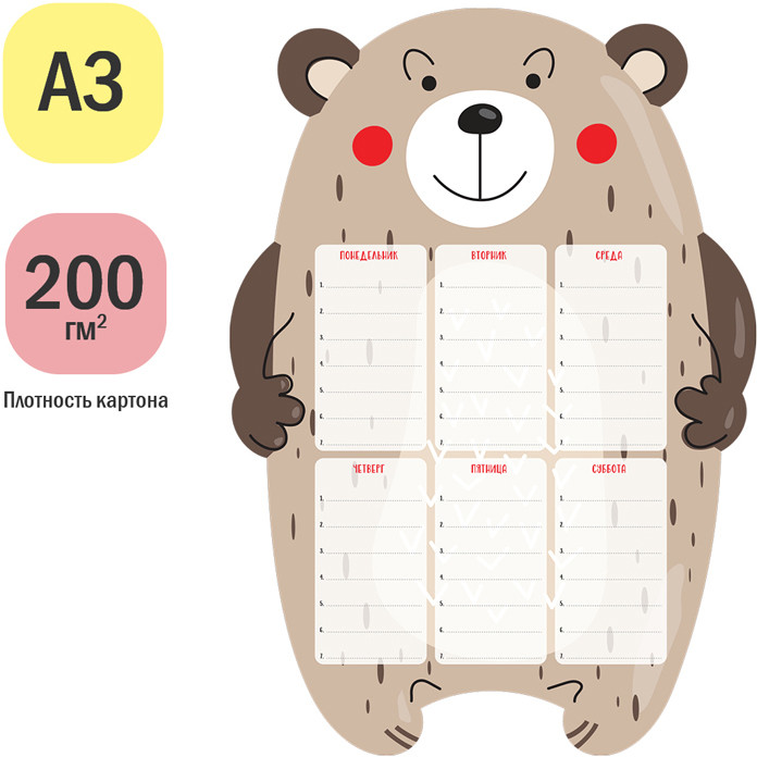 💳 Оплатить за товар можно при получении 🇰🇿 Есть бесплатная доставка по Казахстану от 1 дня 🎁 Копите бонусы с каждой покупки Магнитный планер для расписания уроков ArtSpace «Пиши-Стирай. Bear» — это помощник в планировании школьного дня. Товар выполнен из картона с ламинацией и магнитного винила в формате А3. Планер представлен в универсальном дизайне. Плотность картона: 200 г/кв.м, размер магнитного расписания: 297×420 мм. К комплекту планера прилагается маркер на магните со стирателем, которым очень удобно корректировать записи и крепить к любой металлической поверхности (к примеру — холодильнику). Расписание рассчитано на 6-ти дневную рабочую неделю, по 7 уроков в день. |