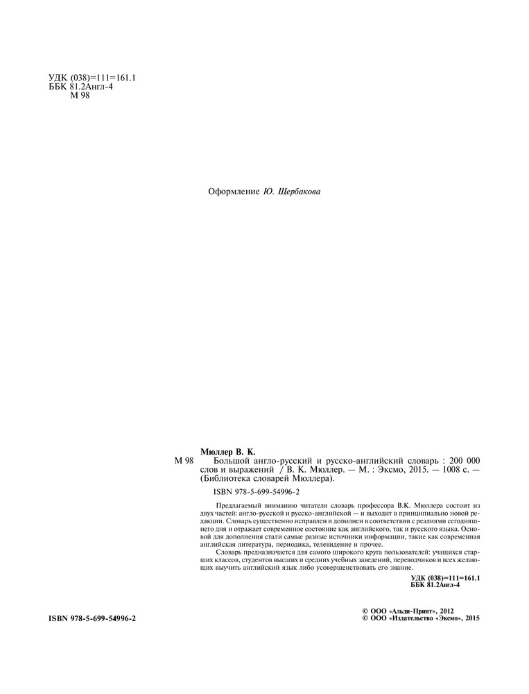 Большой англо-русский и русско-английский словарь. 200 000 слов и выраженийВ данный момент этот товар отсутствует в продаже. Возможно, у нас найдется аналогичный или похожий товар здесь. Серия: Библиотека словарей Мюллера Большой |