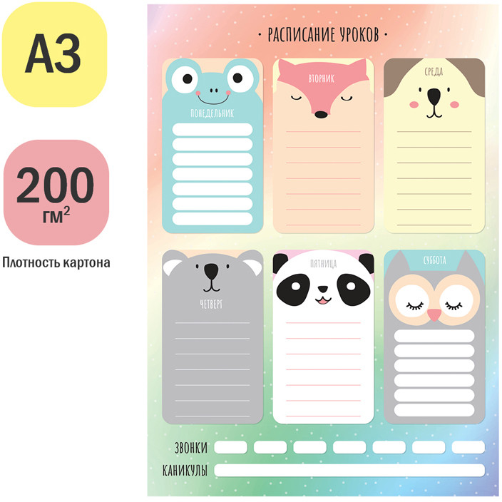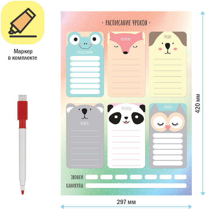 💳 Оплатить за товар можно при получении 🇰🇿 Есть бесплатная доставка по Казахстану от 1 дня 🎁 Копите бонусы с каждой покупки Магнитный планер для расписания уроков ArtSpace «Пиши-Стирай. Animals» — это помощник в планировании школьного дня. Товар выполнен из картона с ламинацией и магнитного винила в формате А3. Планер представлен в женском дизайне. Плотность картона: 200 г/кв.м, размер магнитного расписания: 297×420 мм. К комплекту планера прилагается маркер на магните со стирателем, которым очень удобно корректировать записи и крепить к любой металлической поверхности (к примеру — холодильнику). Расписание рассчитано на 6-ти дневную рабочую неделю, по 7 уроков в день. |