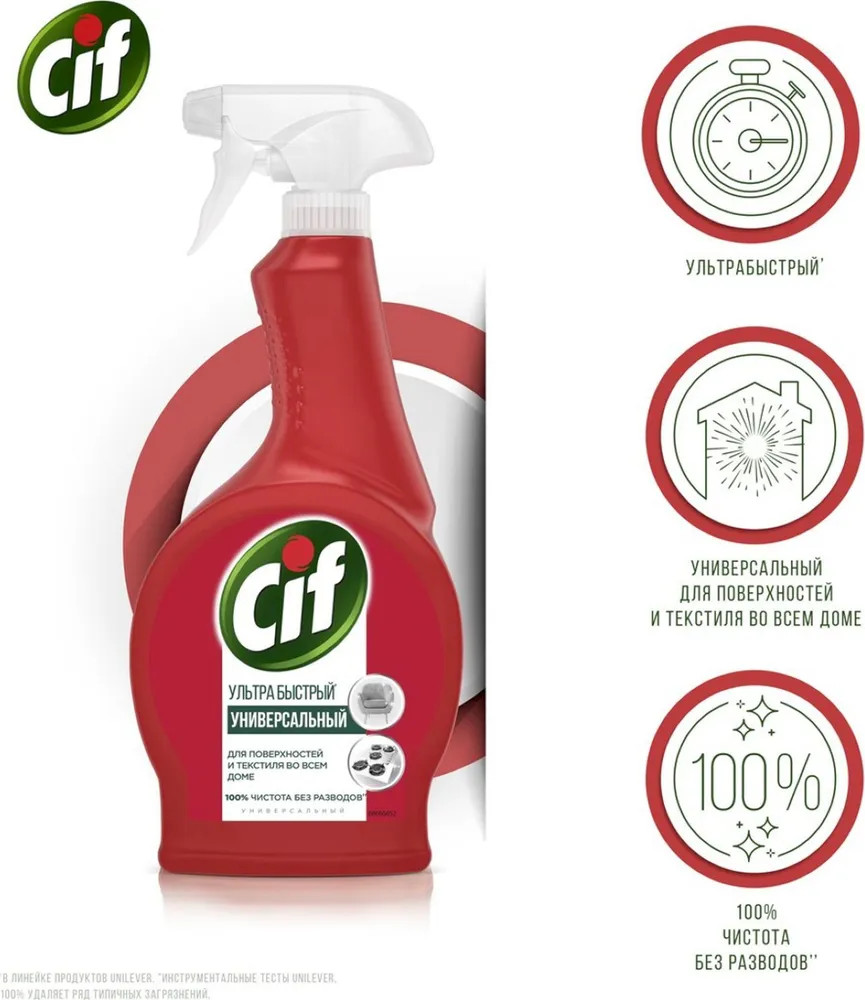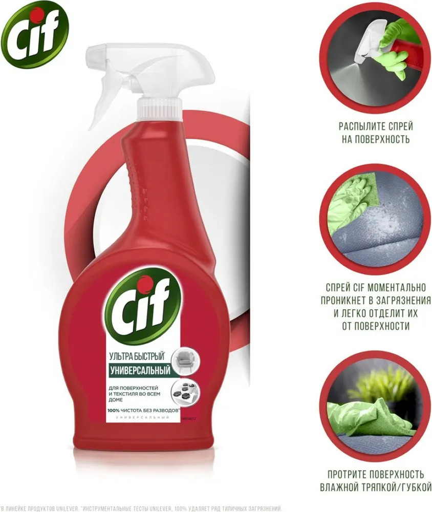 • одежда: распылите спрей Cif на загрязнение, почистите поверхность с помощью тряпки/губки. Смойте под струёй воды;