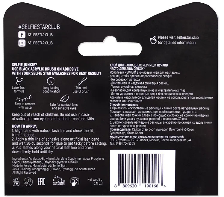 Selfie Star Клей для накладных ресниц с кисточкойВ данный момент этот товар отсутствует в продаже. Возможно, у нас найдется аналогичный или похожий товар здесь. Черный цвет клея прекрасно сочетается со всеми видами темных подводок! Надежно и безопасно зафиксировать накладные ресницы тебе поможет клей SelfieStar. Подходит для всех видов накладных ресниц и пучков. Тонкая кисточка удобна в использовании. Гипоаллергенный состав обеспечивает комфорт, даже если ты носишь линзы. Не содержит латекса. Черный цвет эффектно подчеркнет линию роста ресниц! |