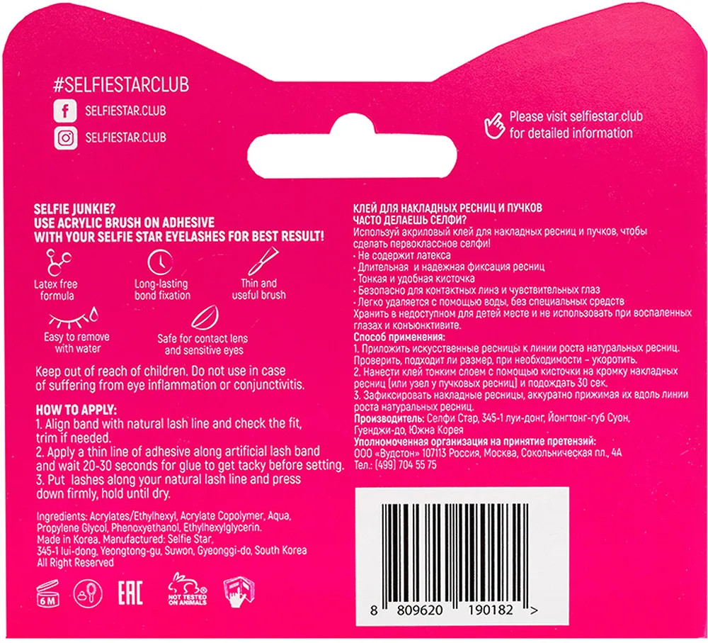 Способ применения: с помощью кисточки нанеси клей тонким слоем на кромку накладных ресниц через 20-30 секунд зафиксируй их, прижимая вдоль линии роста натуральных ресниц. Меры предосторожности: аккуратнее с клеем — старайся, чтобы он не попал в глаза или на натуральные ресницы и не склеил их. При попадании тщательно промой глаза теплой водой. Ресницы Selfie Star предназначены для многоразового использования. После снятия удали с них остатки клея влажным ватным диском и положи обратно в поддон. Храни в недоступном для детей месте и не используй при воспаленных глазах и конъюнктивите.