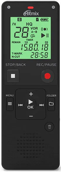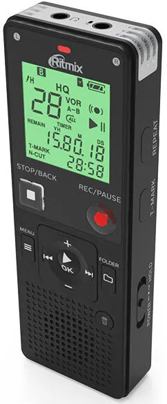 Компактный цифровой диктофон с функцией аудиоплеера, 2 встроенных высококачественных микрофона, стерео запись и разъём для внешнего микрофона. Дополнительно петличный микрофон в комплекте.