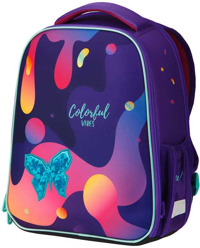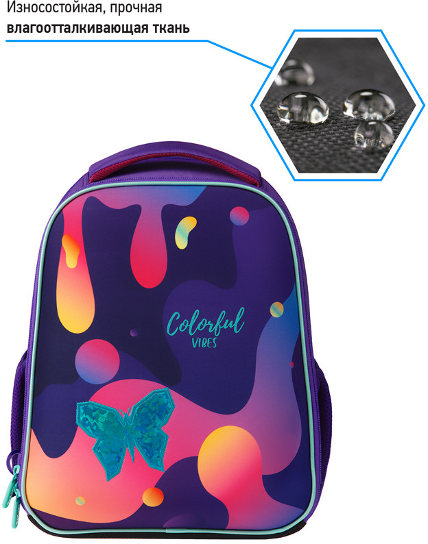 Эргономичный компактный ранец подходит для детей младшего и среднего школьного возраста. Модель выполнена из экологичного ЭВА-материала с покрытием из высокопрочного нейлона. Ранец объёмом 13,5 литров имеет 2 отделения, одно из которых расположено у спинки и предназначено для учебных пособий формата А4+, 2 боковых кармана на резинке, на спинке потайной карман на молнии. Внутри предусмотрены разделители для учебных пособий и именная карточка для подписи.
