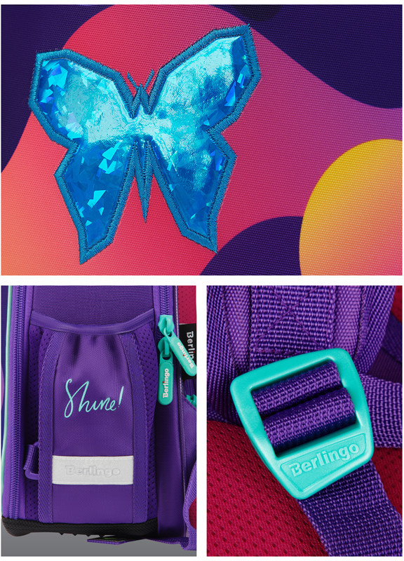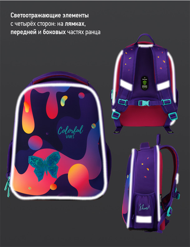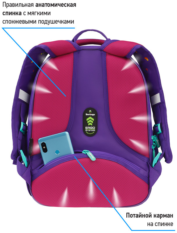 Благодаря анатомической вентилируемой спинке, регулируемым по длине лямкам, а также нагрудному креплению ранец плотно фиксируется на спине ребенка, что помогает равномерно распределить нагрузку и сохранить правильную осанку. Уплотненная мягкая ручка и петля для подвешивания к парте делают ранец очень удобным. Дно выполнено из водонепроницаемого материала с пластиковыми ножками для защиты от влаги. Световозвращающие элементы на лямках, передней и боковых частях ранца обеспечивают безопасность ребенка в темное время суток. Мешок для обуви в комплекте, предусмотрено крепление мешка к ранцу с помощью специальных фиксаторов.