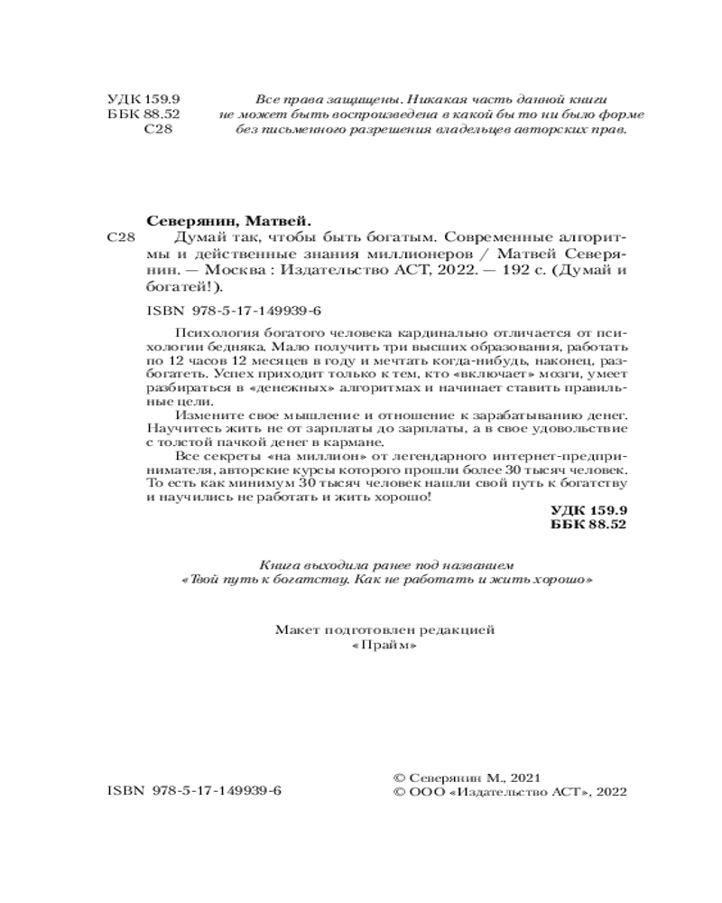 💳 Оплатить за товар можно при получении 🇰🇿 Есть бесплатная доставка по Казахстану от 1 дня 🎁 Копите бонусы с каждой покупки Серия: Думай и богатей! Психология богатого человека кардинально отличается от психологии бедняка. Мало получить три высших образования, работать по 12 часов 12 месяцев в году и мечтать когда-нибудь, наконец, разбогатеть. |