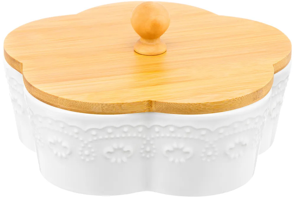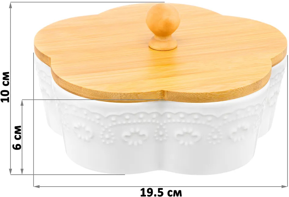 Elan Gallery Банка для печенья «Цветок»В данный момент этот товар отсутствует в продаже. Возможно, у нас найдется аналогичный или похожий товар здесь. Серия: Белый узор Банка для печенья серии «Белый узор» с бамбуковой крышкой подойдет для хранения печенья, конфет, пряников, разнообразных угощений и продуктов. Баночка выполнена из высококачественного белого фарфора в форме цветка и украшена декоративными рельефными узорами. Фарфоровый контейнер отличается от керамики повышенной плотностью. Он не впитывает цвет еды и не деформируется от влаги, чему может быть подвержена керамическая посуда. |