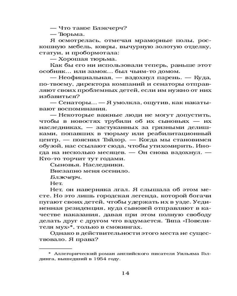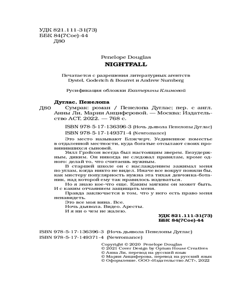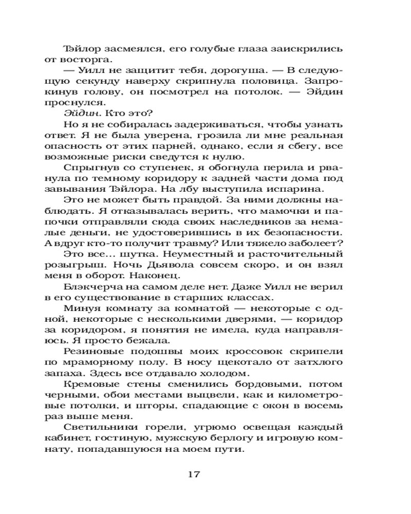 Это место называют Блэкчерч. Уединенное поместье в отдаленной местности, куда богатые отсылают своих провинившихся сыновей. Уилл Грэйсон всегда был настоящим зверем. Безудержным, диким. Он никогда не следовал правилам, кроме одного: делай то, что считаешь нужным. В старшей школе он с наслаждением зажимал меня по углам, когда никто не видел. Иначе все вокруг поняли бы, как мистеру популярность нужна эта тихая девчонка‑ботаник, над которой ему так нравилось издеваться. Но я знаю кое‑что еще. Каким мягким он может быть. И с каким отчаянием защищать меня. Правда заключается в том, что у него есть право меня ненавидеть. Это все моя вина. Все. Ночь дьявола. Видео. Аресты. И я ни о чем не жалею. |