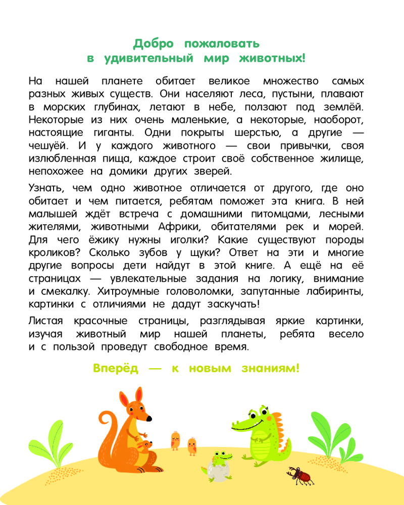 💳 Оплатить за товар можно при получении 🇰🇿 Есть бесплатная доставка по Казахстану от 1 дня 🎁 Копите бонусы с каждой покупки Серия: Главная книга ребёнка «Главная книга о животных» познакомит любознательных малышей с чудесным и разнообразным миром животных, обитающих в разных уголках нашей планеты, — пушистых и пернатых, больших и маленьких, живущих в лесах и саваннах, парящих в небе и плавающих в морях и океанах. Реалистичные фотографии и красочные иллюстрации, а также интересная информация и развивающие задания — малыш сможет узнать о повадках зверей, запомнит названия домашних и диких животных и их детёнышей, с удовольствием будет отгадывать загадки, проходить лабиринты, разгадывать головоломки. Первые уроки по окружающему миру развивают мышление, речь, внимание, память и воображение, расширяет кругозор и пополняет словарный запас. |