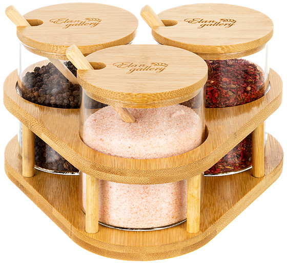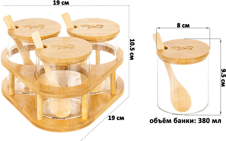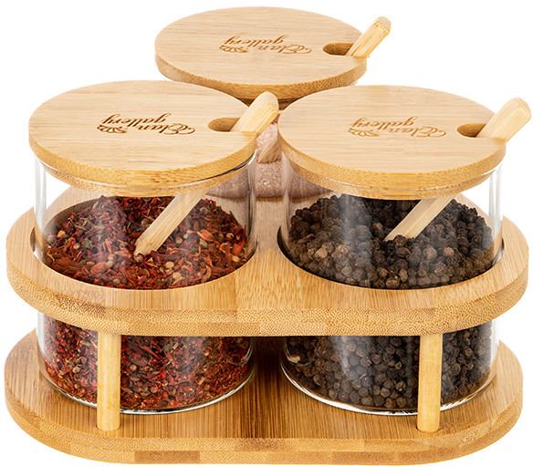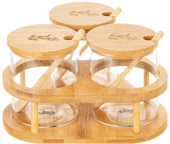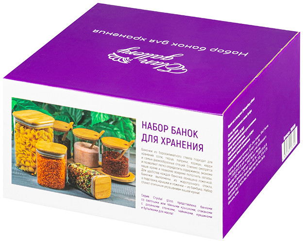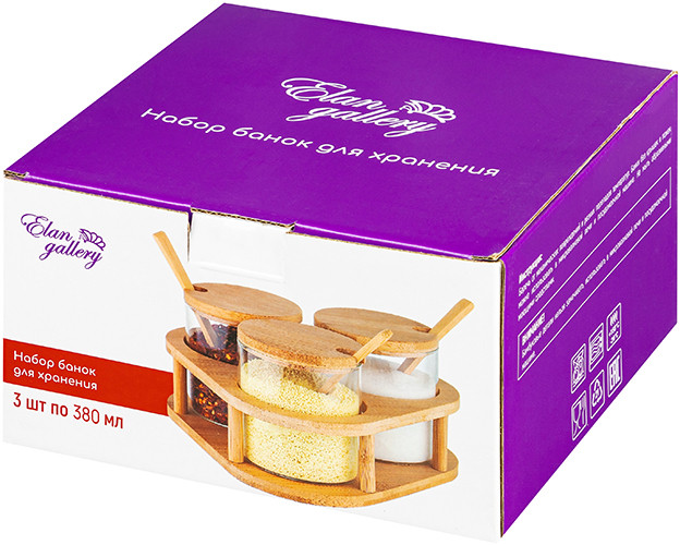 Elan Gallery Набор банок для хранения на подставке с крышками и ложками «Crystal glass»В данный момент этот товар отсутствует в продаже. Возможно, у нас найдется аналогичный или похожий товар здесь. Серия: Crystal glass Набор серии «Crystal glass» состоит из 3-х стеклянных банок объемом по 380 мл на бамбуковой подставке. Оснащены крышками и ложками. Баночки выполнены из боросиликатного стекла. Такие контейнеры подойдут для хранения самых разных сыпучих продуктов и круп, муки, сахара, приправ или разных мелочей. Стильные баночки подойдут к большому количеству самой разной посуды и будут с ней хорошо сочетаться. Можно использовать как набор для специй с сахарницей, солонкой и перечницей. Размер набора 19×19×10,5 см. Размеры емкостей по 8×8×9,5 см. |