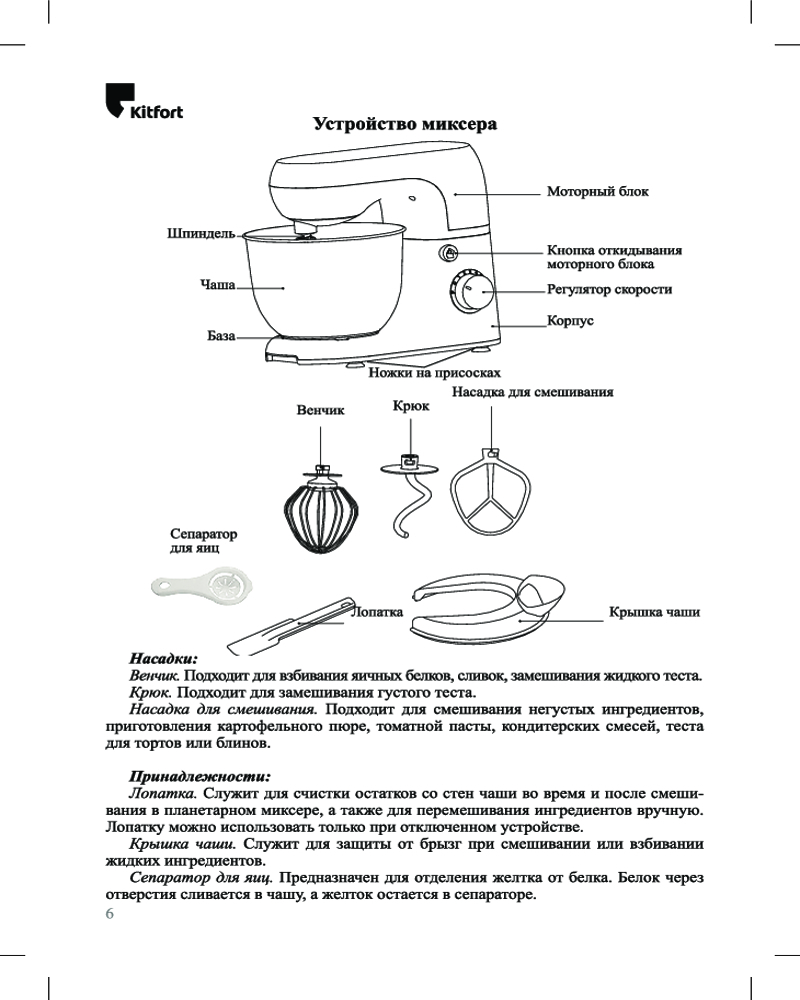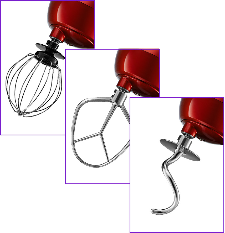 В комплекте идут венчик для взбивания, крюк для замеса крутого теста, насадка для смешивания и приготовления пюре. Форма насадок и чаши подобраны так, что почти при любом количестве продуктов насадка качественно их перемешает.