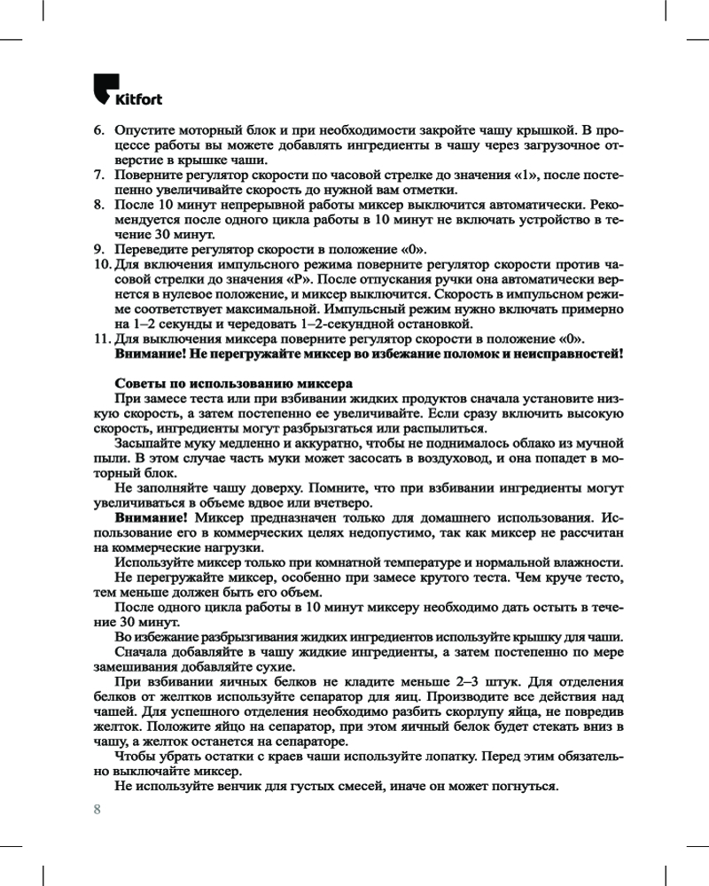 В модели предусмотрено плавное регулирование скорости, поэтому вы всегда сможете выбрать оптимальный режим работы. Импульсный режим используется для особенно высокой мощности. После 1 цикла непрерывной работы в 10 минут миксер автоматически выключается.