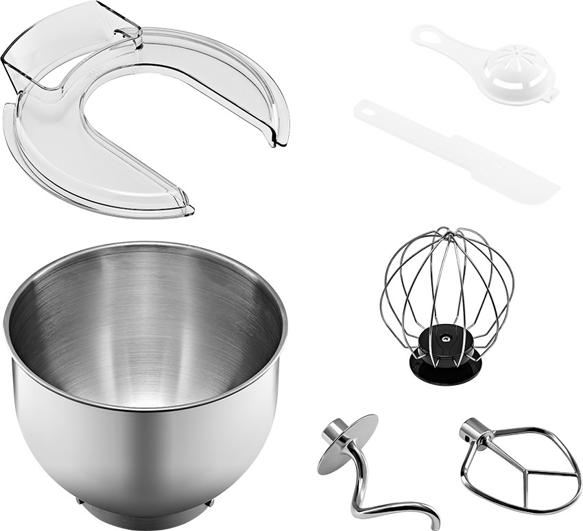В комплекте с планетарным миксером, помимо насадок, чаши и крышки на чашу, идут сепаратор для яиц и лопатка для ручного смешивания и вычищения остатков из чаши.