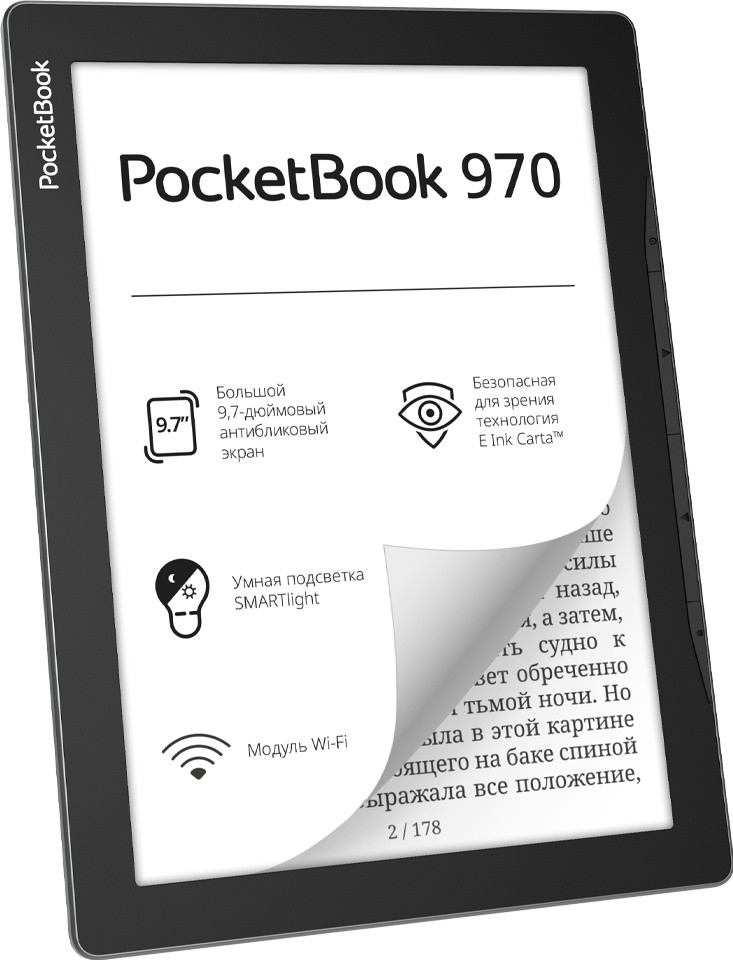 PocketBook 970 — черно-белый ридер для тех, кому мало и 6 дюймов, и 7,8. У PocketBook 970 — целых 9,7 дюйма: экран огромный, максимально похожий на качественную бумагу, с высоким разрешением — и оттого идеально подходящий для литературы нестандартного формата. Например, для комиксов — от графических новелл Мюллера до саг про супергероев. Для газет и журналов. Для различной профессиональной литературы. Словом, для контента со сложной версткой. У PocketBook 970 корпус с металлической рамкой вокруг экрана — это и красиво, и солидно, и надежно.