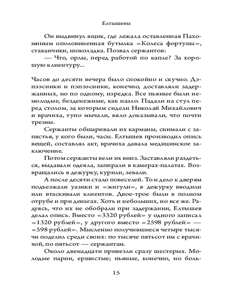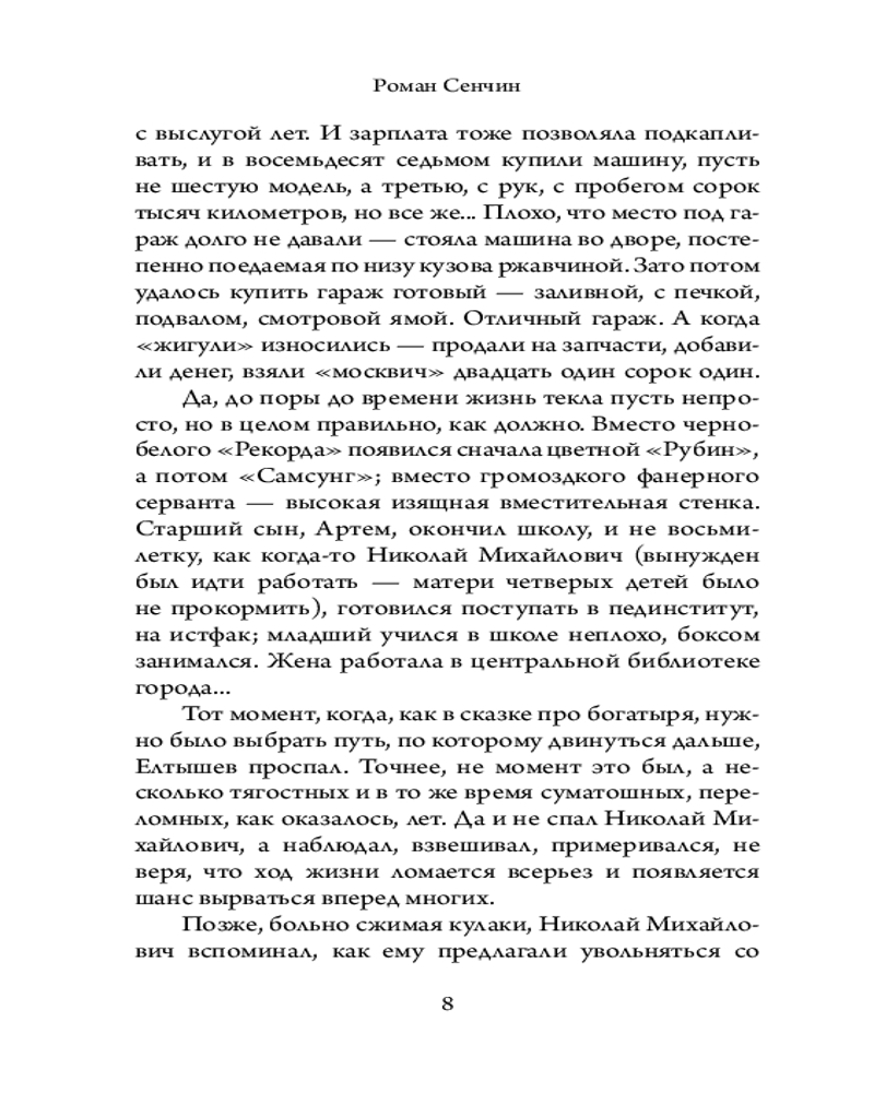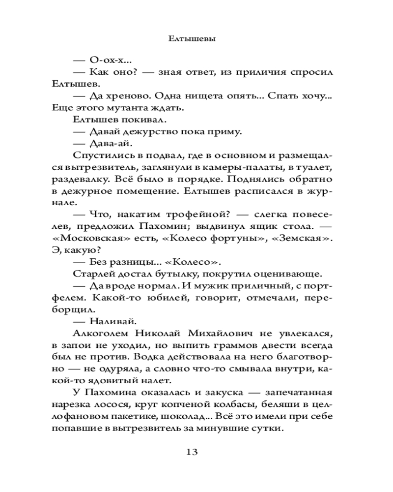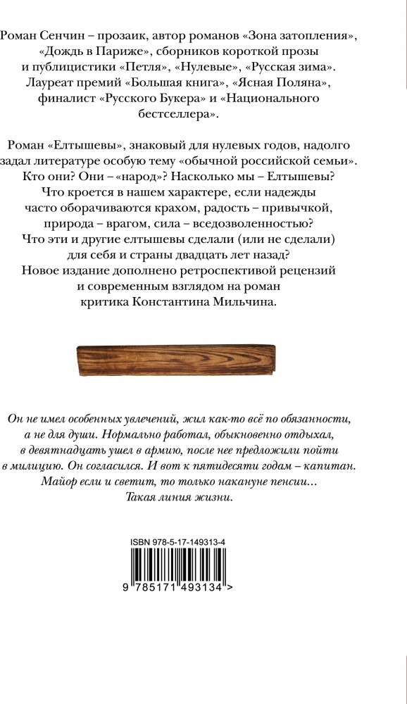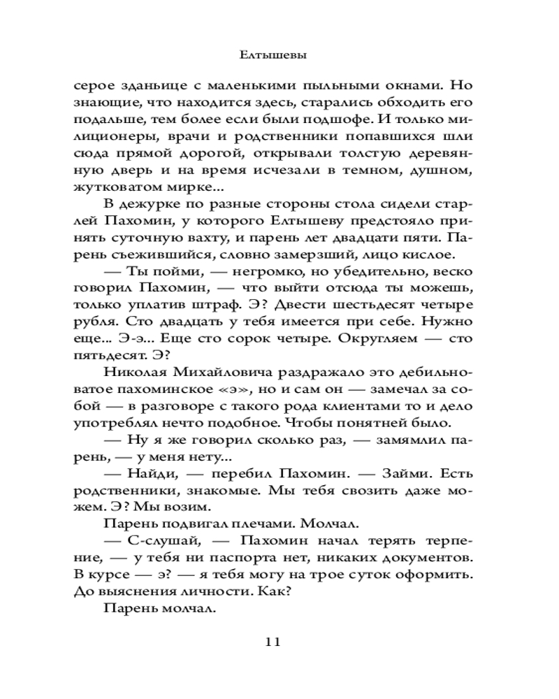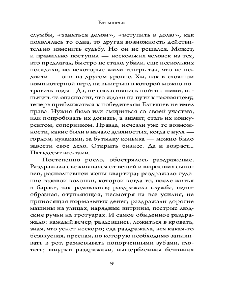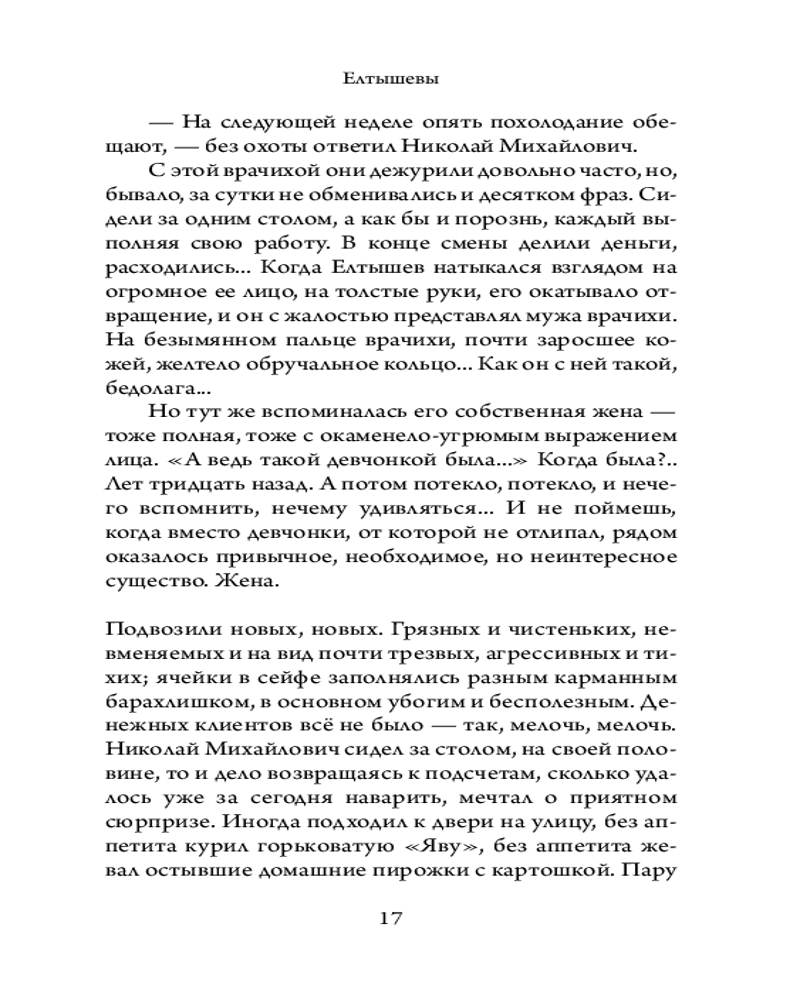Хотя уже давно слушала аудиокнигу "Елташевы"-я её не забыла,помню как долго ходила под впечатлением.Книга о семье,которая после уже как бы налаженной жизни катится вниз. Книга написана простым языком ,без изысков Сорокина,Пилевина, читается легко,но пишется о семье попавшей в нелегкую ситуацию и не сумевшей выбраться из неё. Увидела книгу во Flip, не удержалась купила.