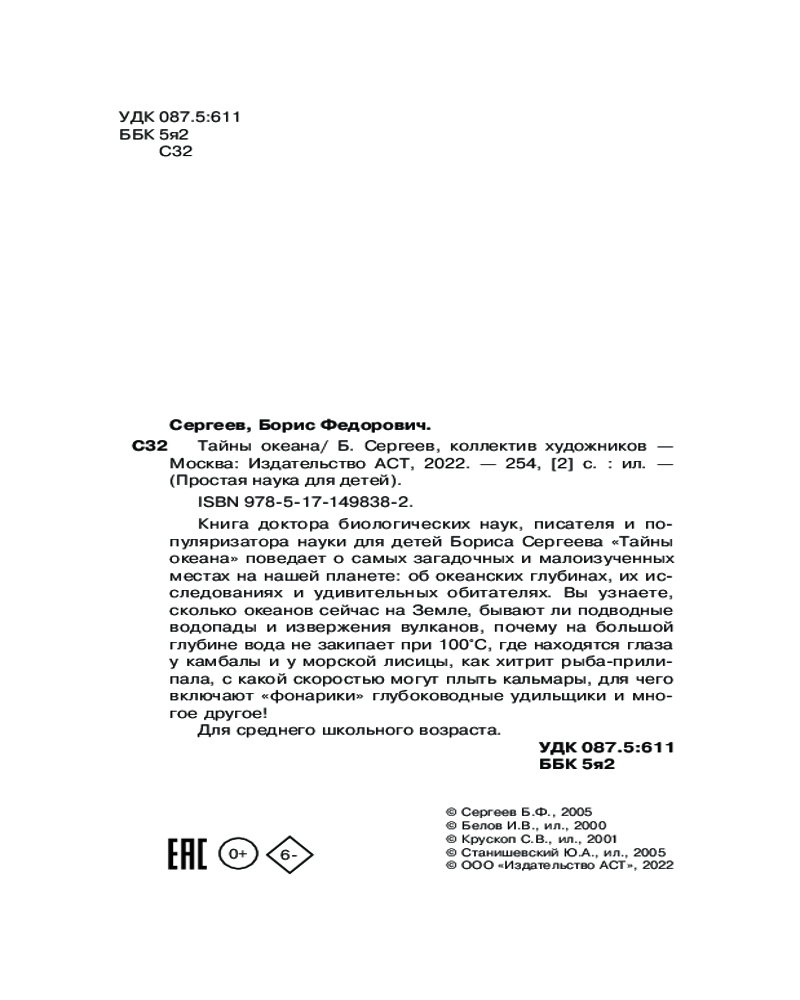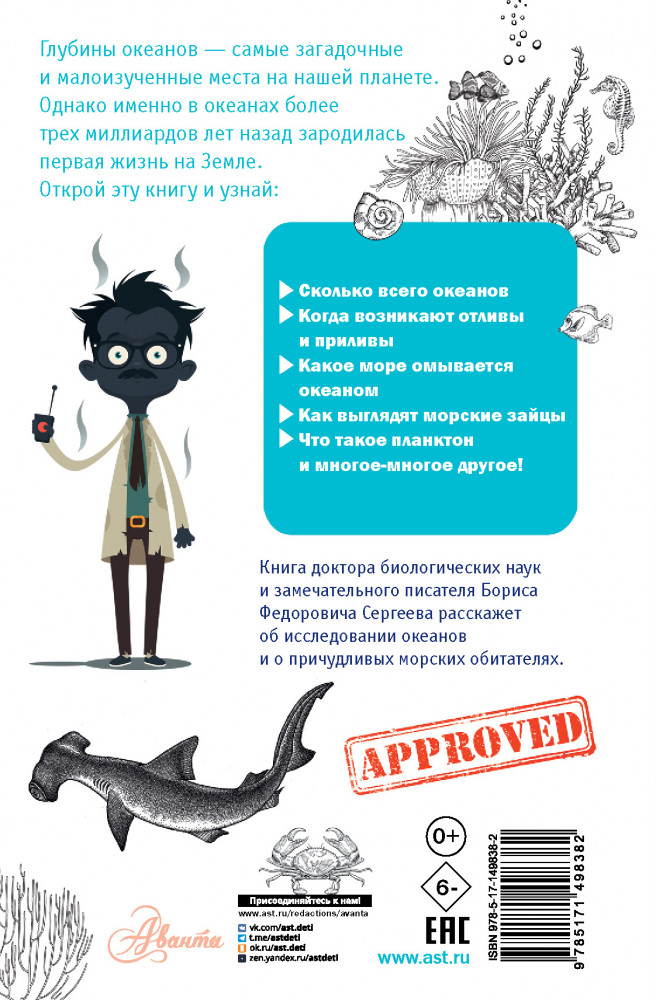 💳 Оплатить за товар можно при получении 🇰🇿 Есть бесплатная доставка по Казахстану от 1 дня 🎁 Копите бонусы с каждой покупки Серия: Простая наука для детей Книга доктора биологических наук, писателя и популяризатора науки для детей Бориса Сергеева «Тайны океана» поведает о самых загадочных и малоизученных местах на нашей планете: об океанских глубинах, их исследованиях и удивительных обитателях. |