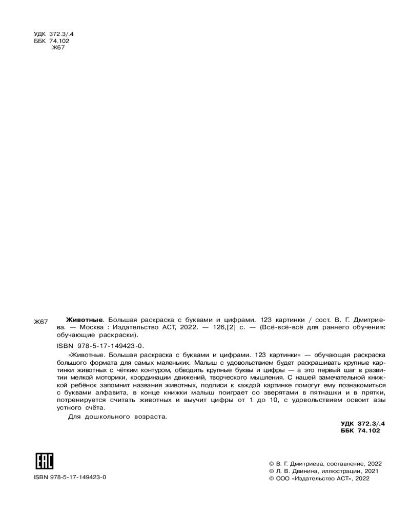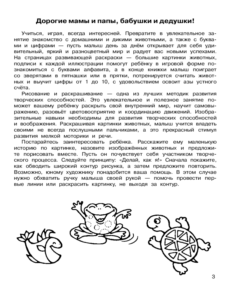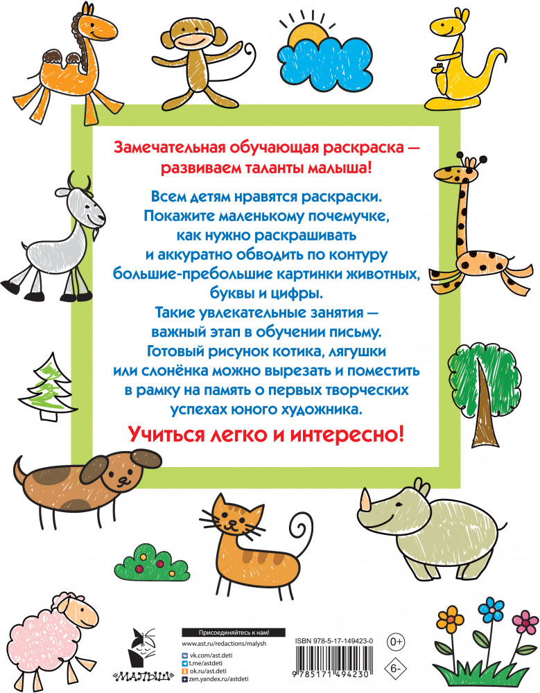 💳 Оплатить за товар можно при получении 🇰🇿 Есть бесплатная доставка по Казахстану от 1 дня 🎁 Копите бонусы с каждой покупки Серия: Всё-всё-всё для раннего обучения: обучающие раскраски «Животные. Большая раскраска с буквами и цифрами» — обучающая раскраска большого формата для самых маленьких. Малыш с удовольствием потренируется раскрашивать крупные картинки животных с чётким контуром, обводить крупные буквы и цифры — а это первый шаг в развитии мелкой моторики, координации движений, творческого мышления. С нашей замечательной книжкой ребёнок запомнит названия животных, подписи к каждой картинке помогут ему познакомиться с буквами алфавита, в конце книжки малыш поиграет со зверятами в пятнашки и в прятки, потренируется считать животных и выучит цифры от 1 до 10, с удовольствием освоит азы устного счёта. |