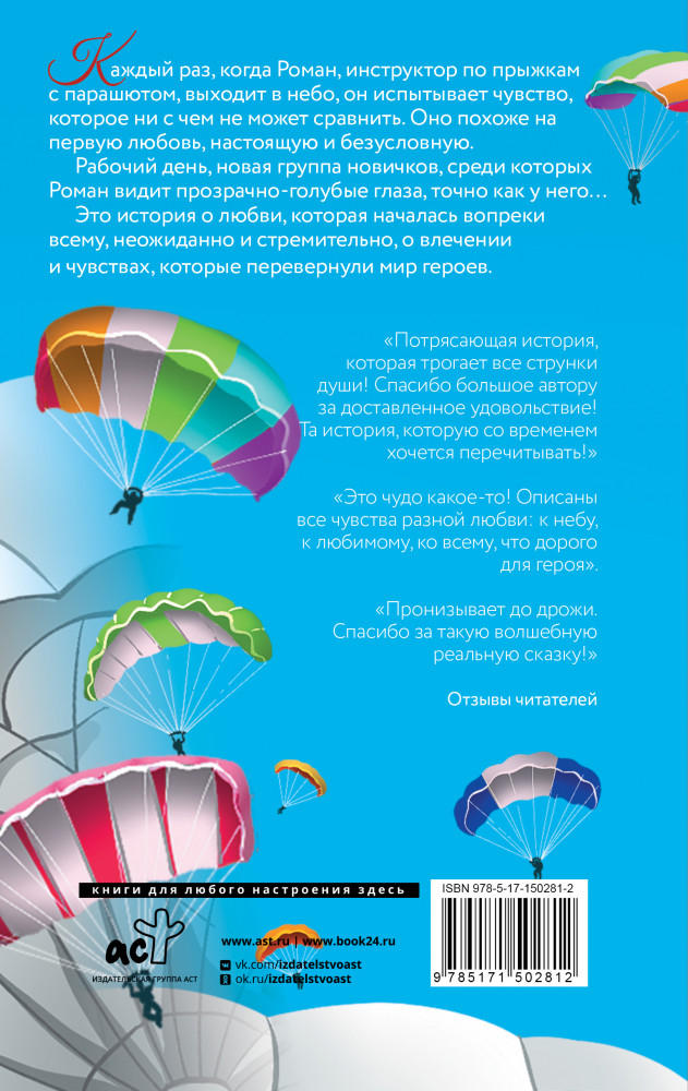 Цветы в небеВ данный момент этот товар отсутствует в продаже. Возможно, у нас найдется аналогичный или похожий товар здесь. Серия: Другая любовь «Каждый раз, когда Роман, инструктор по прыжкам с парашютом, выходит в небо, он испытывает чувство, которое ни с чем не может сравнить. Оно похоже на первую любовь, настоящую и безусловную. Рабочий день, новая группа новичков, среди которых Роман видит прозрачно-голубые глаза, точно как у него... Это история о любви, которая началась вопреки всему, неожиданно и стремительно, о влечении и чувствах, которые перевернули мир героев.» |