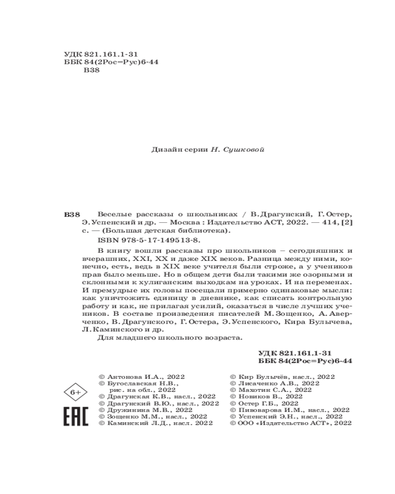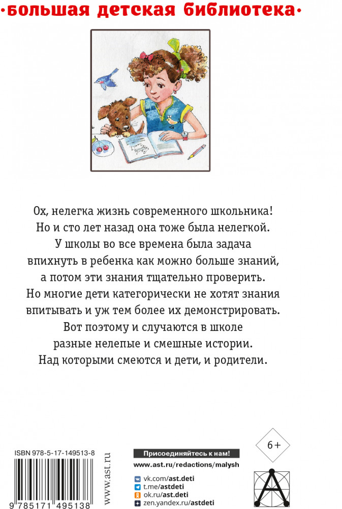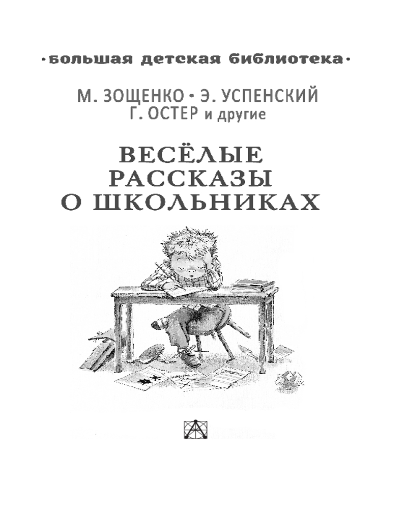 Весёлые рассказы о школьникахГригорий Бенционович Остер, Эдуард Николаевич Успенский, Михаил Михайлович Зощенко В данный момент этот товар отсутствует в продаже. Возможно, у нас найдется аналогичный или похожий товар здесь. Серия: Большая детская библиотека В книгу вошли рассказы про школьников — сегодняшних и вчерашних, XXI, XX и даже XIX веков. Разница между ними, конечно, есть, ведь в XIX веке учителя были строже, а у учеников прав было меньше. Но в общем дети были такими же озорными и склонными к хулиганским выходкам на уроках. И на переменах. И премудрые их головы посещали примерно одинаковые мысли: как уничтожить единицу в дневнике, как списать контрольную работу и как, не прилагая усилий, оказаться в числе лучших учеников. В составе произведения писателей М. Зощенко, А. Аверченко, В. Драгунского, Г. Остера, Э. Успенского, Кира Булычева, Л. Каминского и др. |