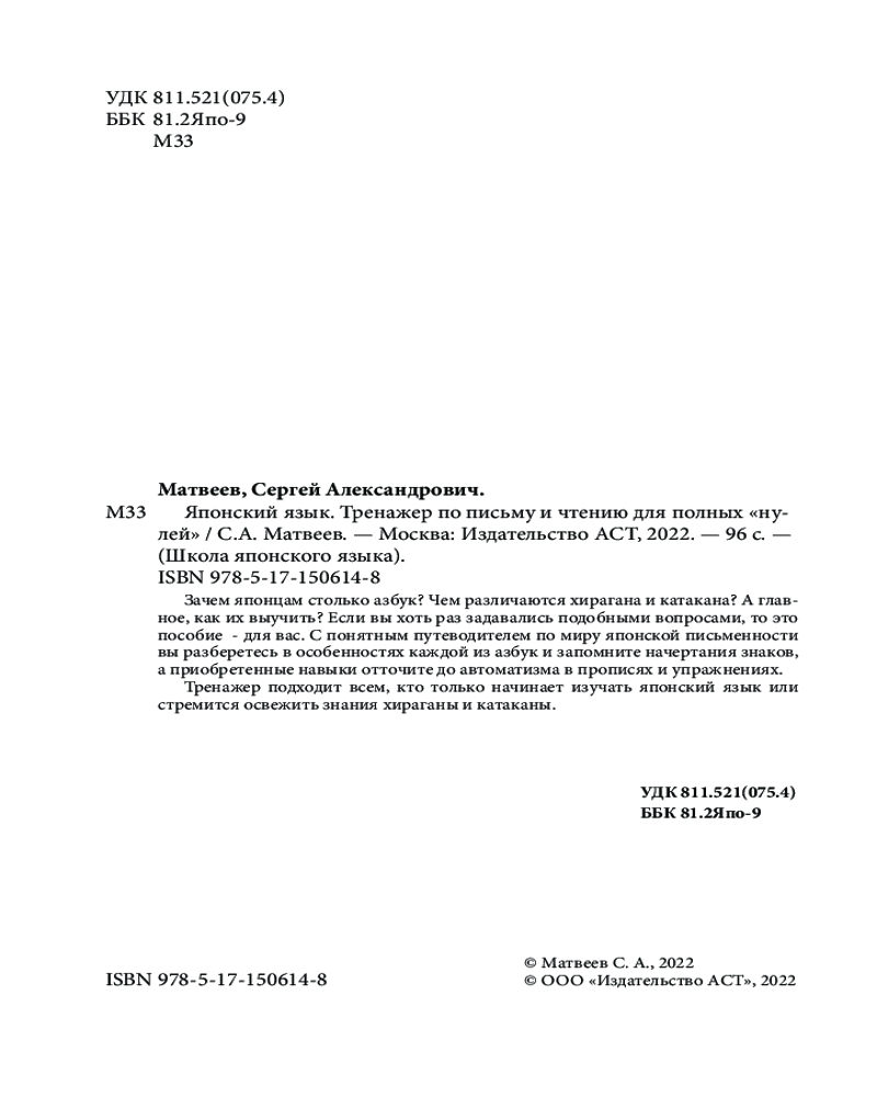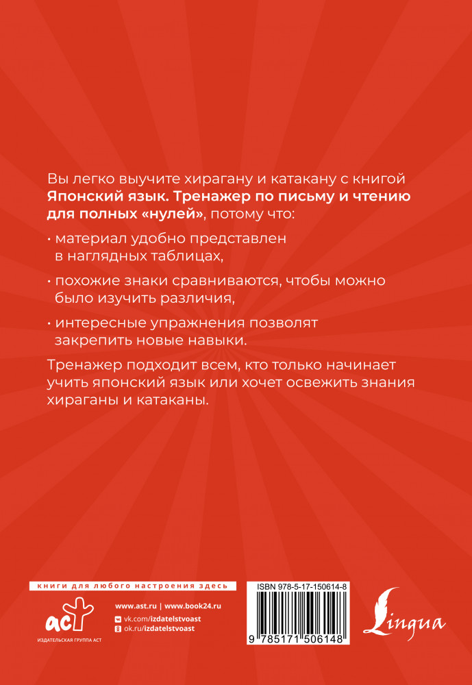 💳 Оплатить за товар можно при получении 🇰🇿 Есть бесплатная доставка по Казахстану 🎁 Копите бонусы с каждой покупки Серия: Школа японского языка Зачем японцам столько азбук? Чем различаются хирагана и катакана? А главное, как их выучить? Если вы хоть раз задавались подобными вопросами, то это пособие — для вас. С понятным путеводителем по миру японской письменности вы разберетесь в особенностях каждой из азбук и запомните начертания знаков, а приобретенные навыки отточите до автоматизма в прописях и упражнениях. |