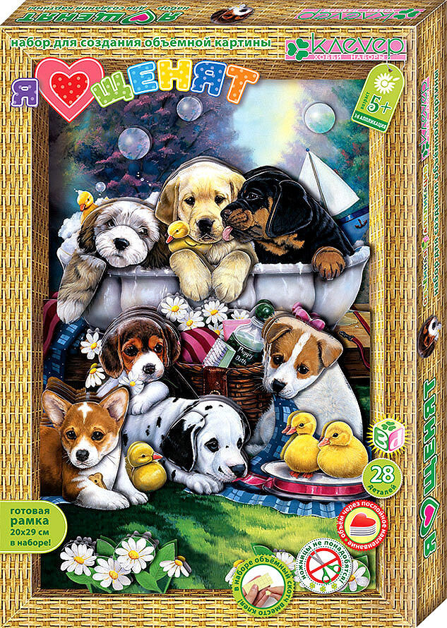 Клевер Набор для создания картины «Я люблю щенят»В данный момент этот товар отсутствует в продаже. Возможно, у нас найдется аналогичный или похожий товар здесь. Красочная картина «Я люблю щенят» ребёнок с помощью взрослых сможет сделать сам — без клея и ножниц, в технике 3-D аппликации. Персонажи картины — забавные щенята-шалуны, которые купаются на зеленой лужайке вместе с пушистыми утятами. Работая с набором, ребёнок учится складывать трёхмерное изображение из частей, составляя перспективу. Рамку собирать не нужно — красочная и глубокая готовая рамка входит в набор. Клей также не нужен — вместо него в наборе объёмный двусторонний скотч. |