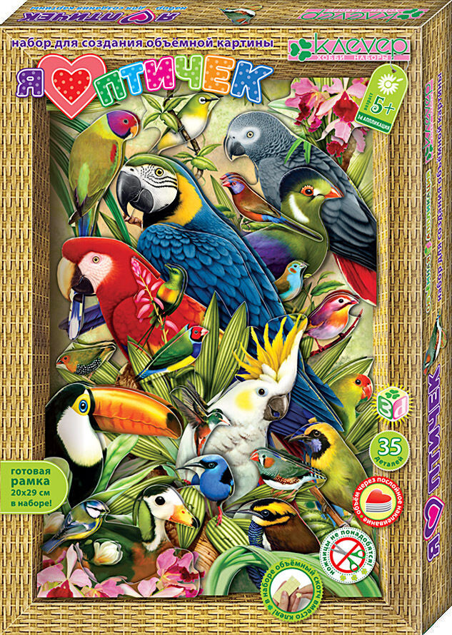 Клевер Набор для создания картины «Я люблю птичек»В данный момент этот товар отсутствует в продаже. Возможно, у нас найдется аналогичный или похожий товар здесь. Красочную картину ребёнок с помощью взрослых сможет сделать сам — без клея и ножниц, в технике 3-D аппликации. Работая с набором, ребёнок учится складывать трёхмерное изображение из частей, составляя перспективу. Рамку собирать не нужно — красочная и глубокая готовая рамка входит в набор. Клей также не нужен — вместо него в наборе объёмный двусторонний скотч. |