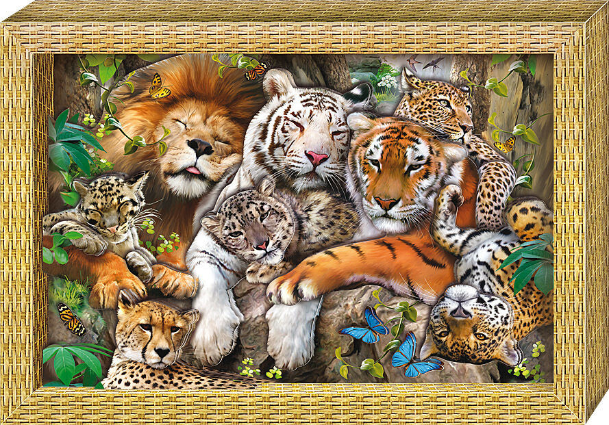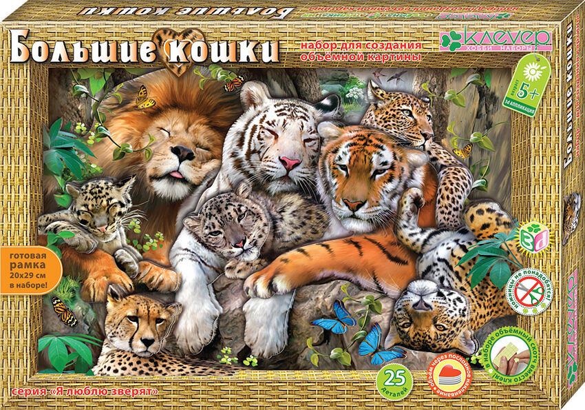 Клевер Набор для создания картины «Большие кошки»В данный момент этот товар отсутствует в продаже. Возможно, у нас найдется аналогичный или похожий товар здесь. Яркую картину «Большие кошки» ребёнок с помощью взрослых может сделать сам — без клея и ножниц, в технике 3-D аппликации. Лев и тигр, гепард и леопард — их не встретишь вместе в природе. Грациозные, величественные хищники, иногда игривые, как простые кошки, отдыхают на этой картине, словно лучшие друзья. Работая с набором, ребёнок учится складывать трёхмерное изображение из частей, составляя перспективу. Рамку собирать не нужно — красочная и глубокая готовая рамка входит в набор. Клей также не нужен — вместо него в наборе объёмный двусторонний скотч. |