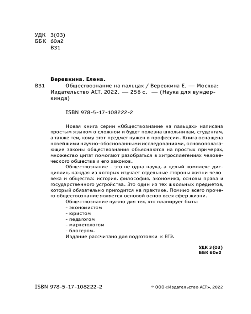 Обществознание на пальцахВ данный момент этот товар отсутствует в продаже. Возможно, у нас найдется аналогичный или похожий товар здесь. «Обществознание на пальцах» — издание, предназначенное для подготовки к ЕГЭ и общего развития. Внутри читатель найдет исчерпывающую информацию об обществознании как дисциплине, которая включает в себя:- основы общественных наук;- введение в право;- начала социальной психологии;- базовые принципы политологии и экономики;- знания, полезные для повседневной жизни. |
