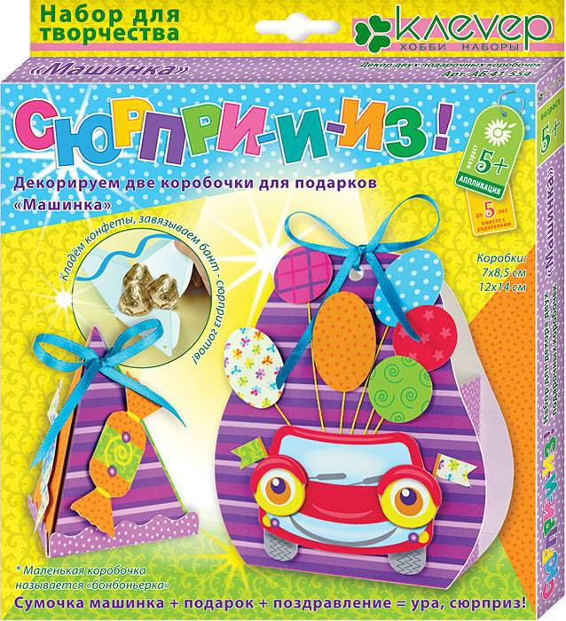 Клевер Набор для творчества «Машинка»В данный момент этот товар отсутствует в продаже. Возможно, у нас найдется аналогичный или похожий товар здесь. Серия: Сюрприз Даже самый небольшой подарок становится приятней и интересней, если он красиво упакован. Давайте сделаем две ярких коробочки: одну побольше с яркой машинкой, с карточкой для поздравления, и вторую поменьше, она называется бонбоньерка. Ребёнку от пяти лет будет несложно сделать стильные коробочки, ведь их изготовление превращается в игру. Все картонные детали коробочек готовы, — их только нужно вынуть из основы и склеить; бумажные детали несложных форм — их легко вырезать и наклеить на детали коробочек с помощью двусторонней клеящейся ленты вместо клея. Бант из ленты скрепит стороны коробочки и украсит её макушку — работа над набором будет приятна и вам, и ребёнку. |