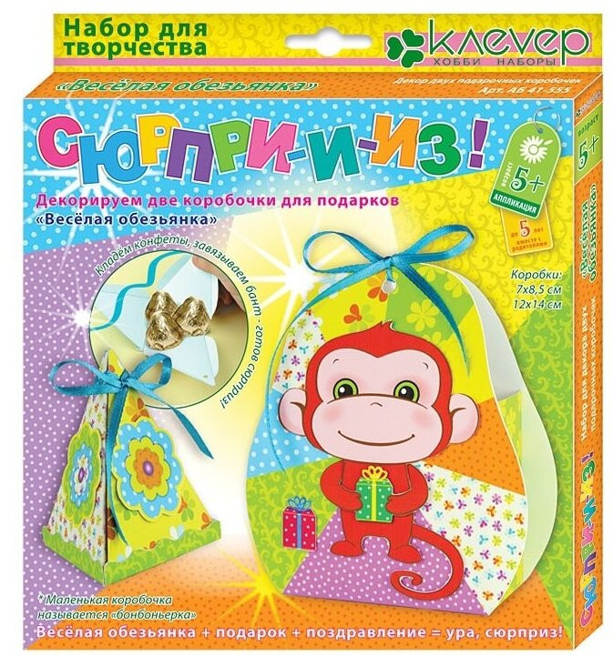 Клевер Набор для творчества «Веселая обезьянка»В данный момент этот товар отсутствует в продаже. Возможно, у нас найдется аналогичный или похожий товар здесь. Серия: Сюрприз Даже самый небольшой подарок становится приятней и интересней, если он красиво упакован. Давайте сделаем две ярких коробочки: одну побольше с объёмной фигуркой обезьянки, с карточкой для поздравления, и вторую поменьше, она называется бонбоньерка. Ребёнку от пяти лет будет несложно сделать стильные коробочки, ведь их изготовление превращается в игру. Все картонные детали коробочек готовы, — их только нужно вынуть из основы и склеить; бумажные детали несложных форм — их легко вырезать и наклеить на детали коробочек с помощью двусторонней клеящейся ленты вместо клея. Бант из ленты скрепит стороны коробочки и украсит её макушку — работа над набором будет приятна и вам, и ребёнку. |