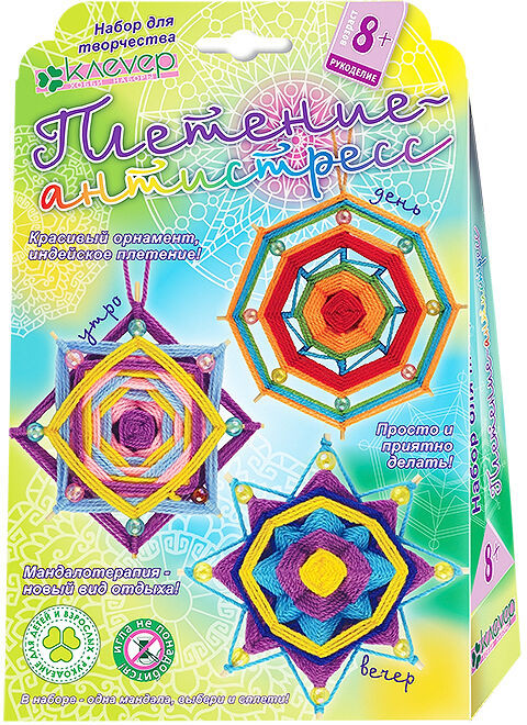 С набором для творчества «Плетение-антистресс» от производителя «Клевер» можно создать своими руками такое оригинальное украшение для дома, как «Мандала — День». Из акриловых ниток, бусинок и деревянных палочек, входящих в комплект, получается красивая плетеная звезда — символ дня. А несложный процесс изготовления доставит удовольствие мастерице и вдохновит на новые творческие успехи.