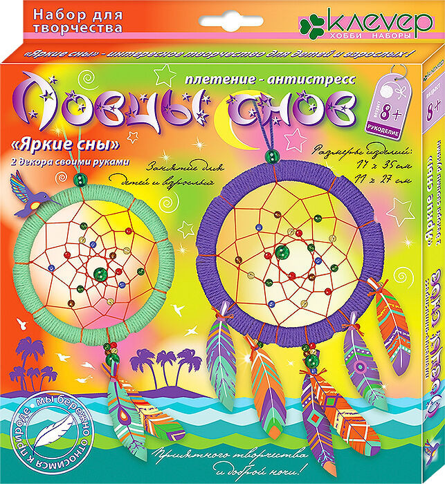 Клевер Набор для творчества «Яркие сны»В данный момент этот товар отсутствует в продаже. Возможно, у нас найдется аналогичный или похожий товар здесь. Набор для изготовления двух ловцов снов — красочное воздушное изделие из пряжи, нитей, бусин и бумаги. Индейские легенды гласят: если повесить «ловца» у изголовья кровати, он будет пропускать только хорошие и яркие сны, а плохие и злые — задерживать в своей паутинке. Плетение «ловца» успокаивает и снимает стресс. Для облегчения создания этого чуда, мы придумали круг с выемками для намотки нитей, подобрали интересные цветовые сочетания разных материалов. В наборе нет настоящих перьев — нам жалко птиц, вместо них предлагаем сделать яркие декоративные перья из бумаги! Насыщенные цвета пряжи и бумажных перьев этого набора придадут готовым изделиям выразительный вид, сделают их ярким пятном интерьера. Вы можете сделать сразу двух «ловцов» из одного набора! Плетите вместе с мамой или с друзьями, себе и в подарок! |
